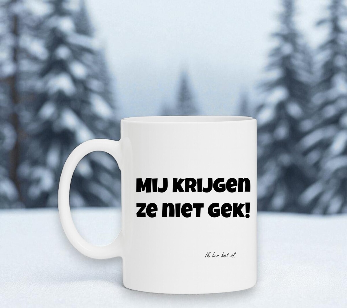 Grappige mok voor op je werk. Mij krijgen ze niet gek! in hele kleine lettertjes staat onderin ik ben het al. De witte koffie of thee mok is vaatwasserbestendig en magnetronbestendig. De mok heeft een hoogte van 96mm en een diameter van 80mm.