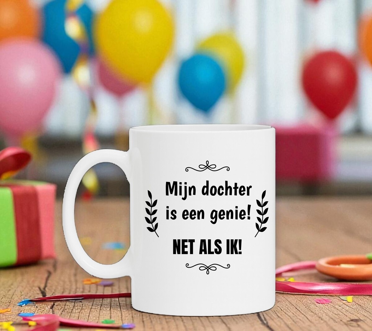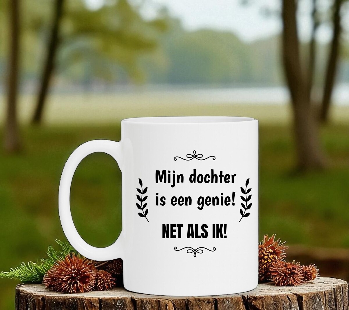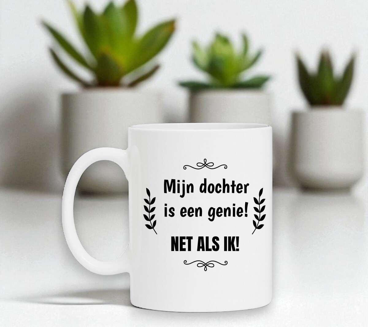 Witte koffie of thee mok mijn dochter is een genie! net als ik! Grappig cadeau voor je moeder met haar verjaardag of met Moederdag. De witte koffie of thee mok is vaatwasserbestendig en magnetronbestendig. De mok heeft een hoogte van 96mm en een diameter van 80mm.