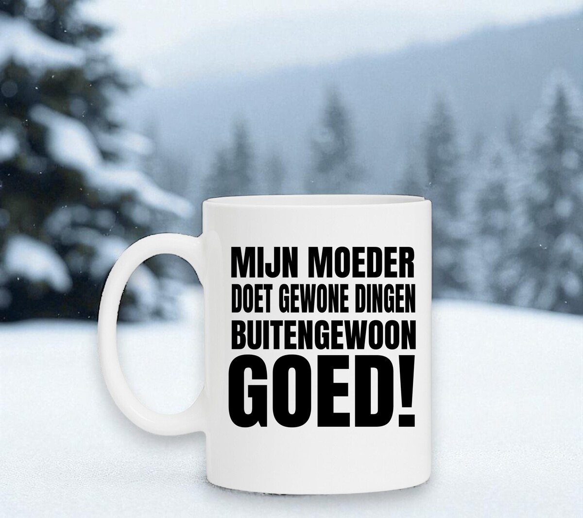 Leuke mok voor je moedersverjaardag of je geeft het cadeau met moederdag. Op de witte koffie of thee mok staat de tekst 'Mijn moeder doet gewone dingen buitengewoon goed!'.