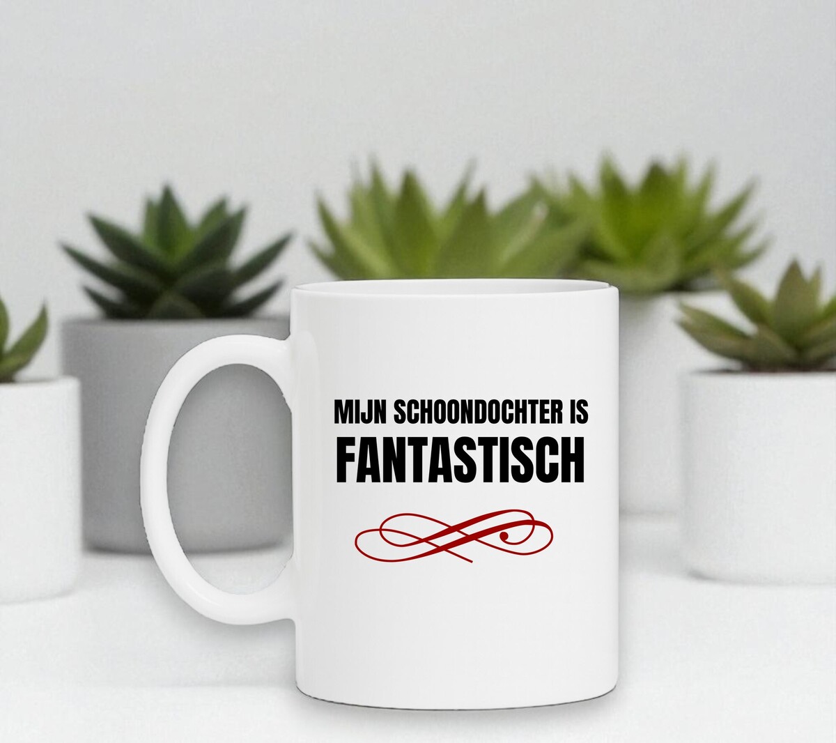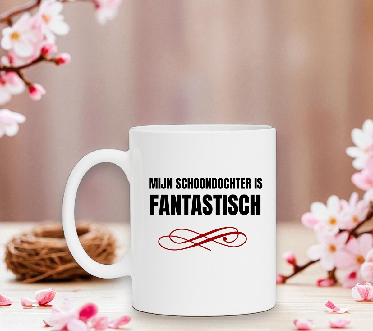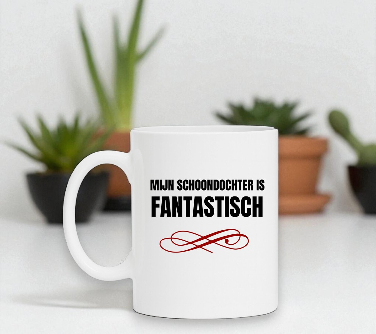 Een leuk cadeau voor je schoonmoeder om als schoondochter te geven. Op de mok staat de opdruk 'Mijn schoondochter is fantastisch'. De mok is magnetron en vaatwasserbestendig en de witte mok heeft een hoogte van 96mm en een diameter van 80mm.