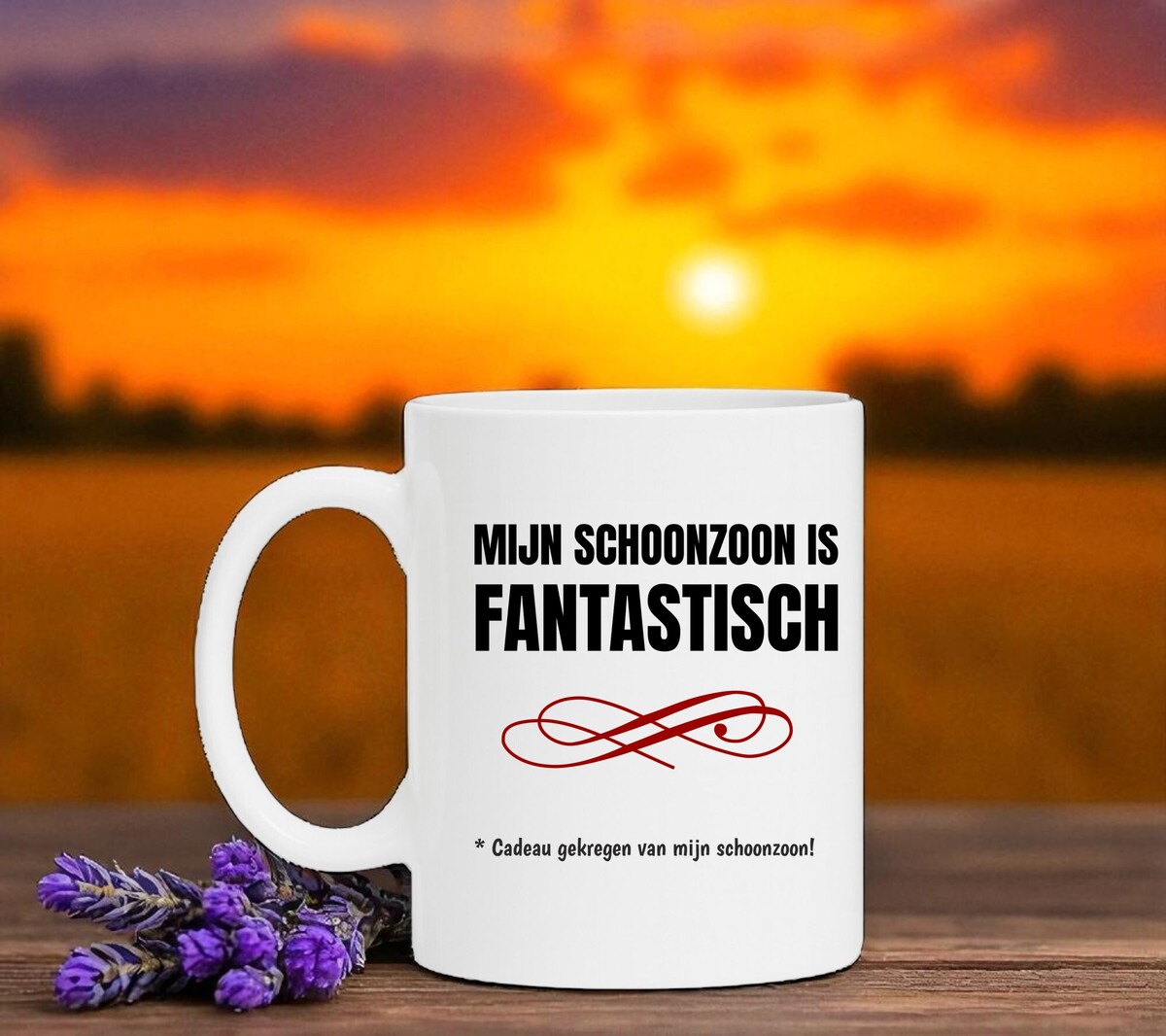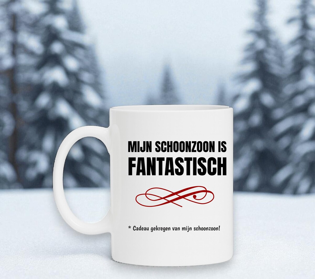 Een hele grappig koffie of thee mok voor je schoonmoeder of schoonvader cadeau te geven. Op de mok staat de tekst 'Mijn schoonzoon is fantastisch. *cadeau gekregen van mijn schoonzoon! De mok is magnetron en vaatwasserbestendig en de witte mok heeft een hoogte van 96mm en een diameter van 80mm.