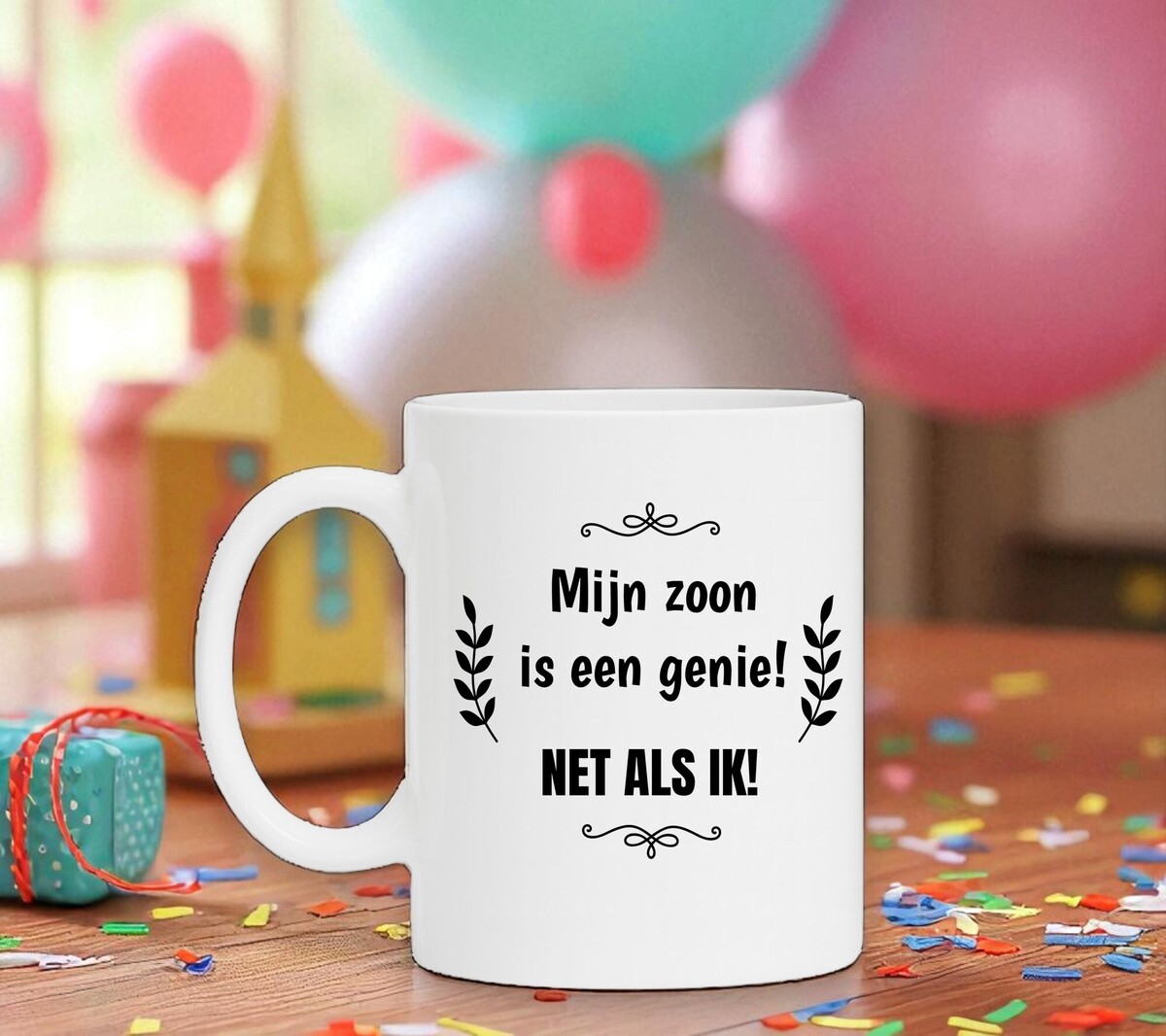Grappig koffie mok om je moeder kado te geven. Op de mok staat de opdruk mijn zoon is een genie! net als ik! De witte koffie of thee mok is vaatwasserbestendig en magnetronbestendig. De mok heeft een hoogte van 96mm en een diameter van 80mm.