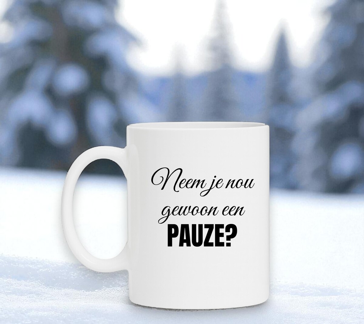 Mok Neem je nou gewoon een pauze? leuk koffie mok voor op de werkvloer! De witte koffie of thee mok is vaatwasserbestendig en magnetronbestendig. De mok heeft een hoogte van 96mm en een diameter van 80mm.