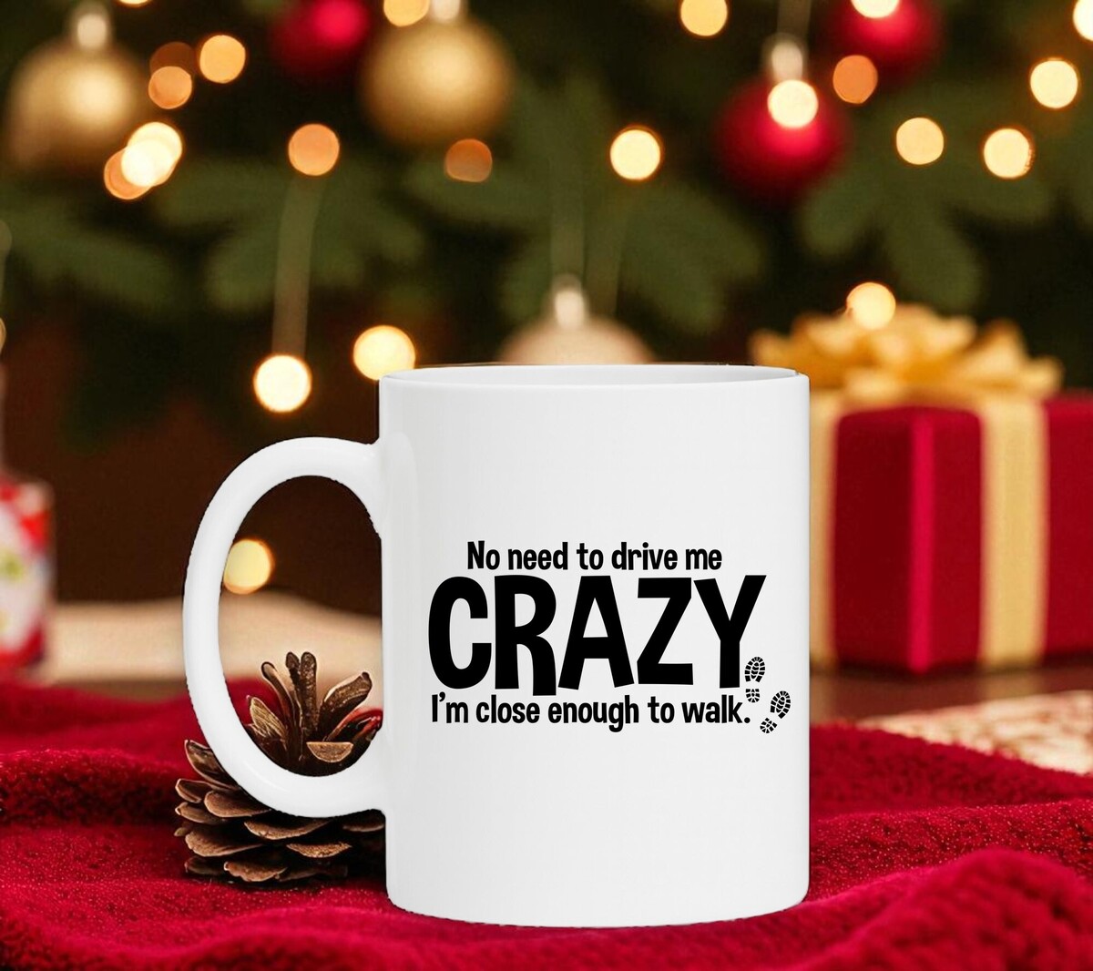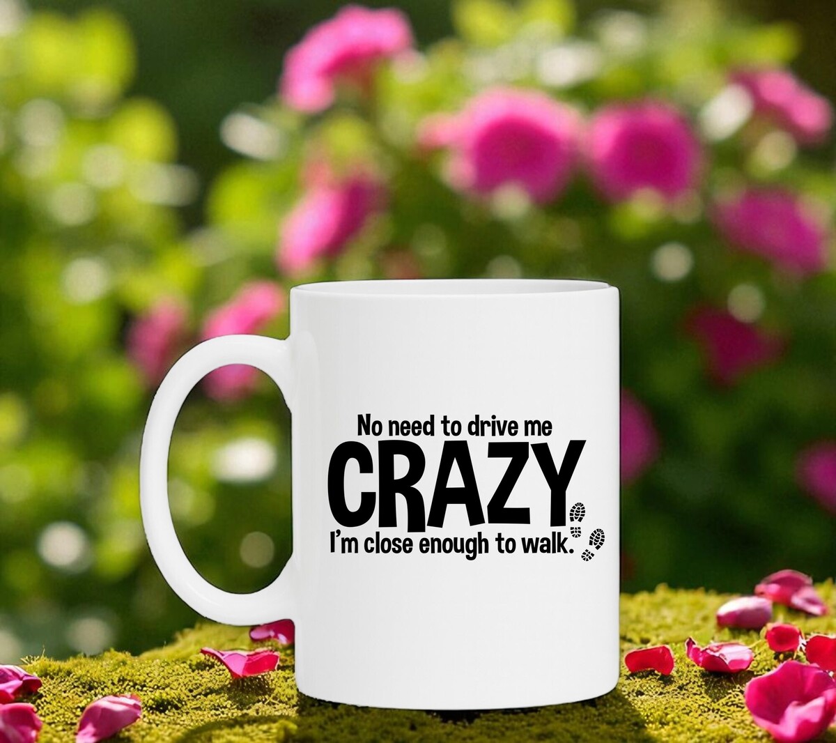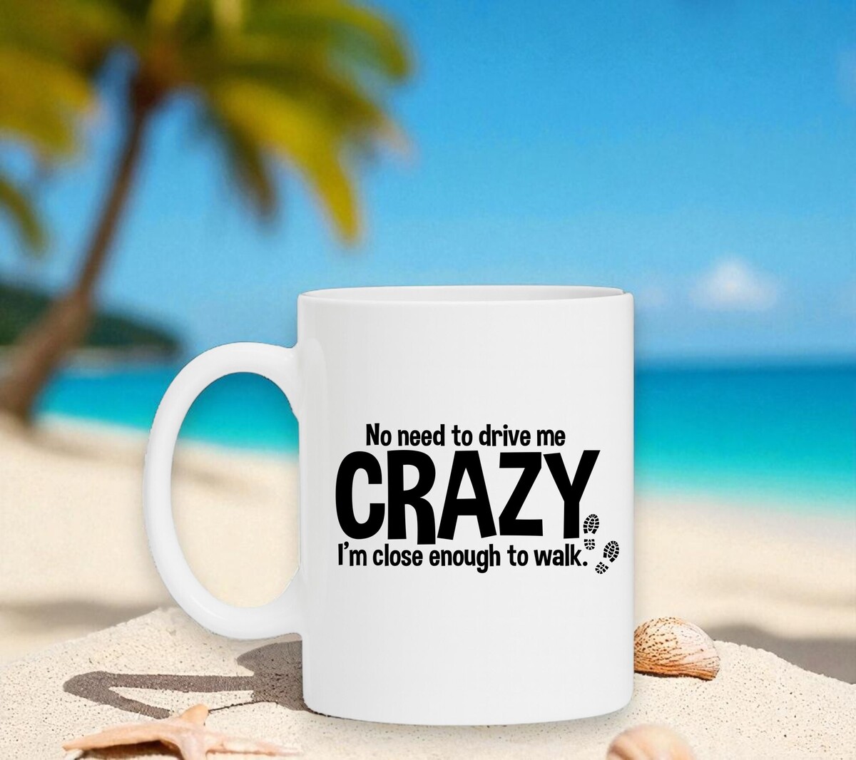Mok no need to drive me crazy i'm close enough to walk. De witte koffie of thee mok is vaatwasserbestendig en magnetronbestendig. De mok heeft een hoogte van 96mm en een diameter van 80mm.