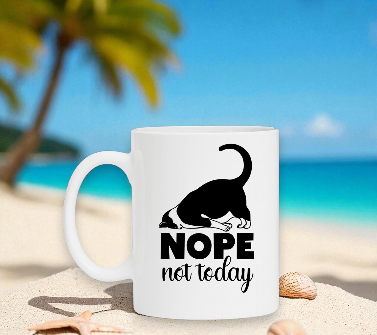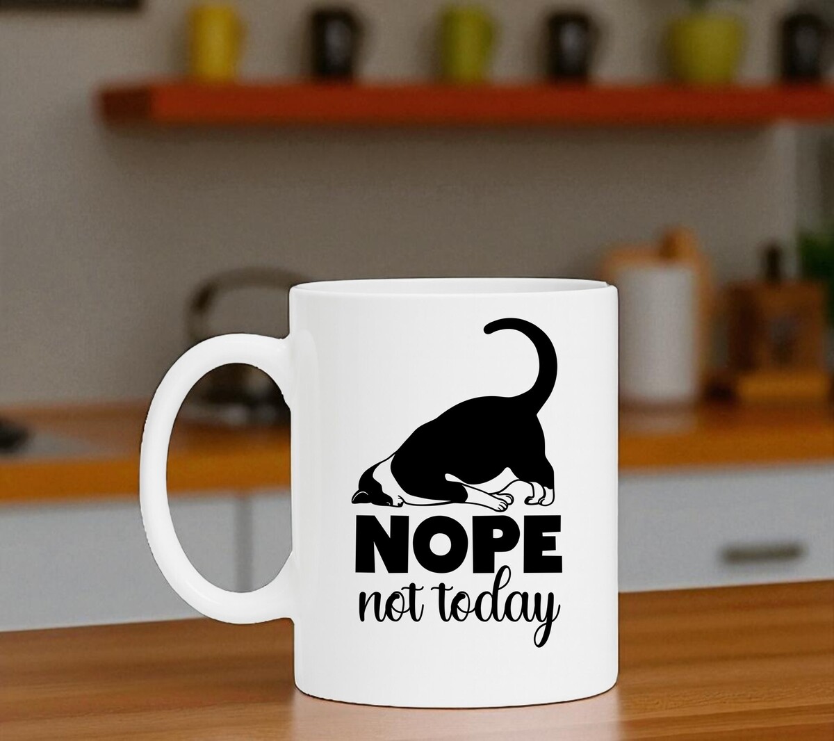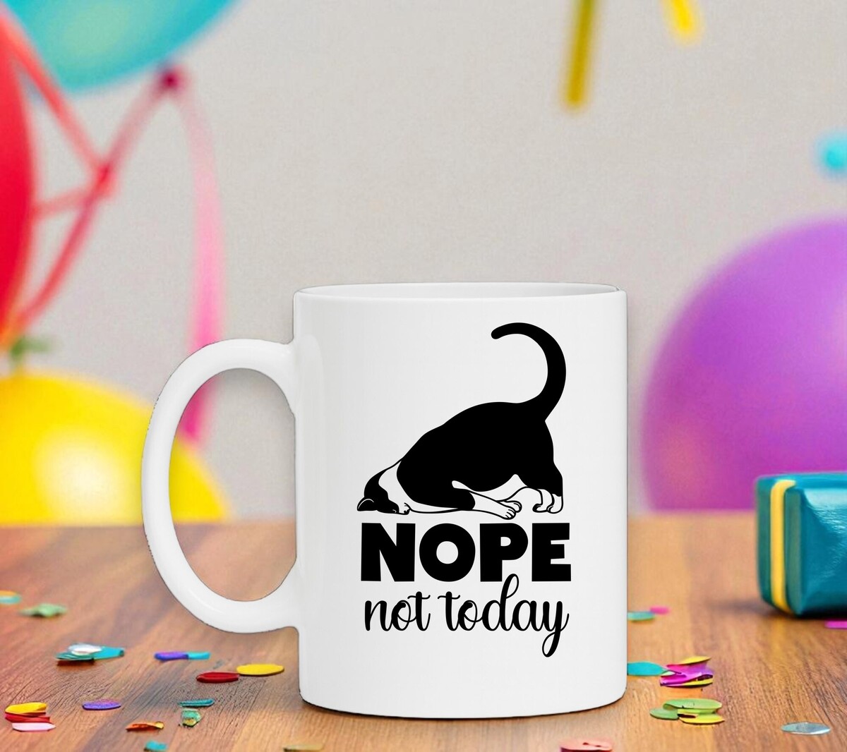 Een leuk koffiemok voor op je werk! Op de mok staat een kat afgebeeld die er geen zin in heeft. Onder de kat staat de tekst nope not today. De witte koffie of thee mok is vaatwasserbestendig en magnetronbestendig. De mok heeft een hoogte van 96mm en een diameter van 80mm.