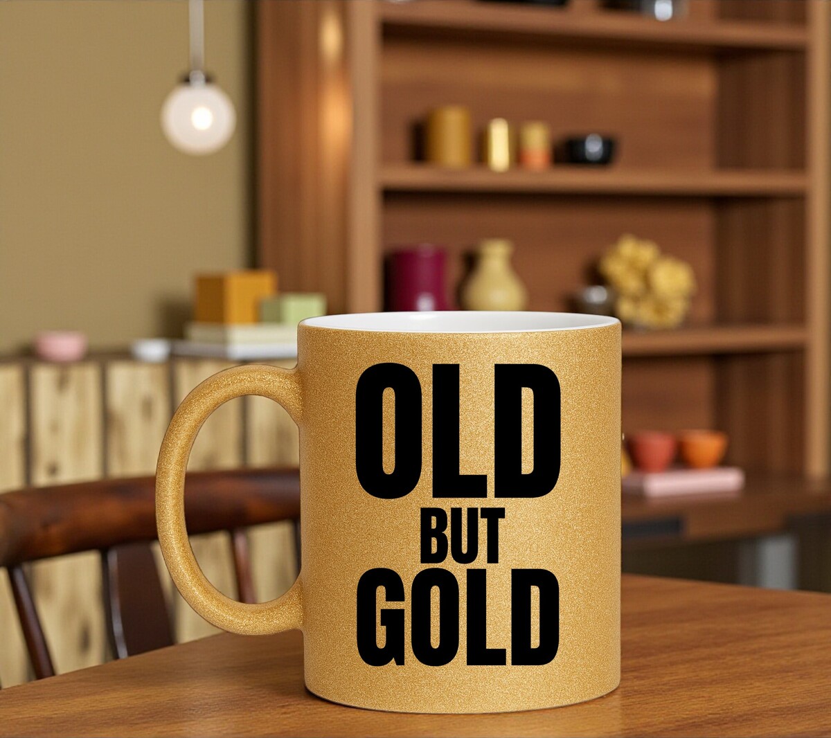 De gouden glittermok heeft een hoogte van 96 mm, een diameter van 80 mm en een inhoud van circa 330 ml. Door de glittercoating is deze mok niet geschikt voor de magnetron en wordt handwas aanbevolen om de opdruk en glans te behouden.