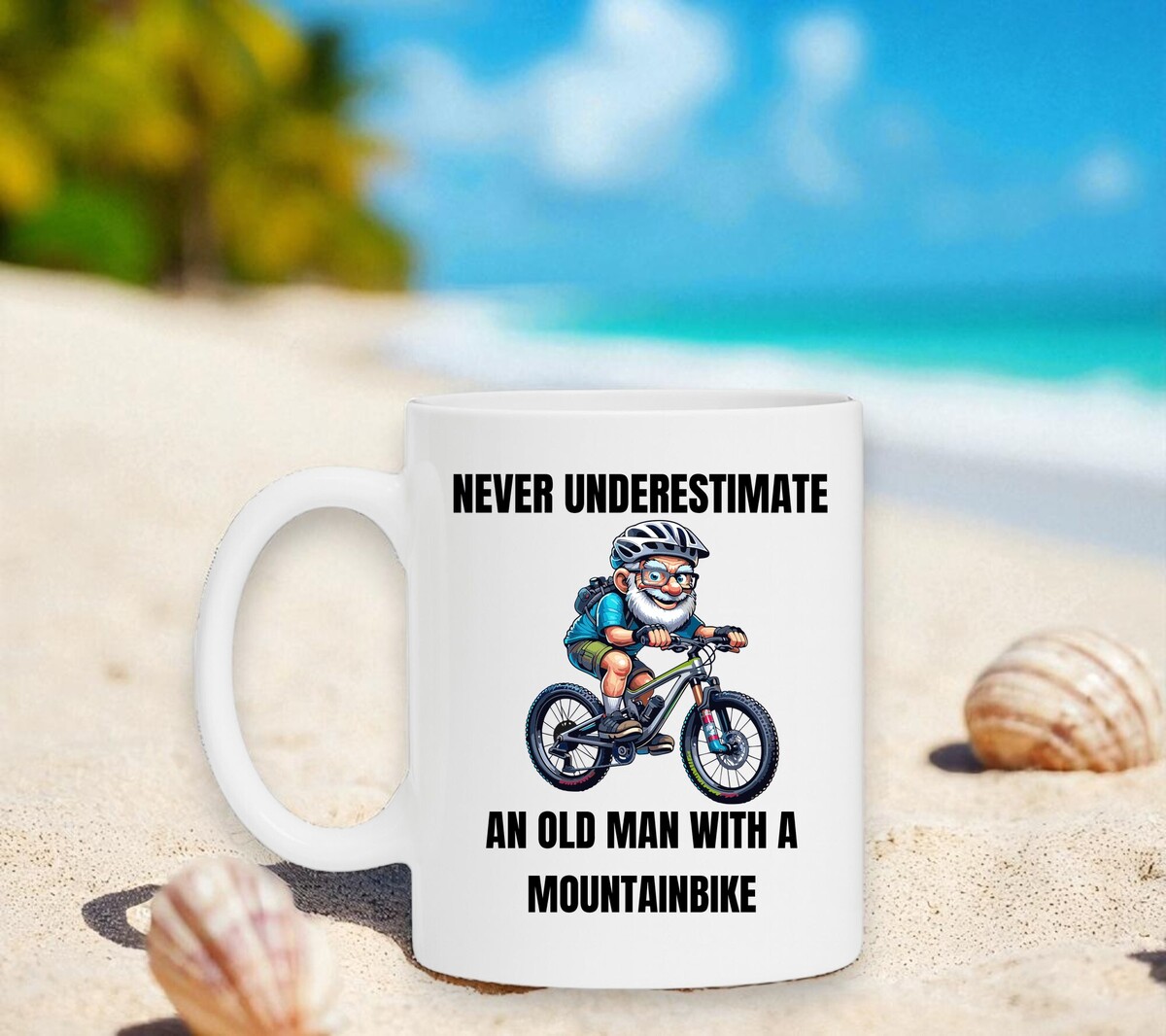 Onwijs leuke koffie of thee mok voor een mountainbiker op leeftijd 'Never underestimate an Old Man with a Mountainbike'.