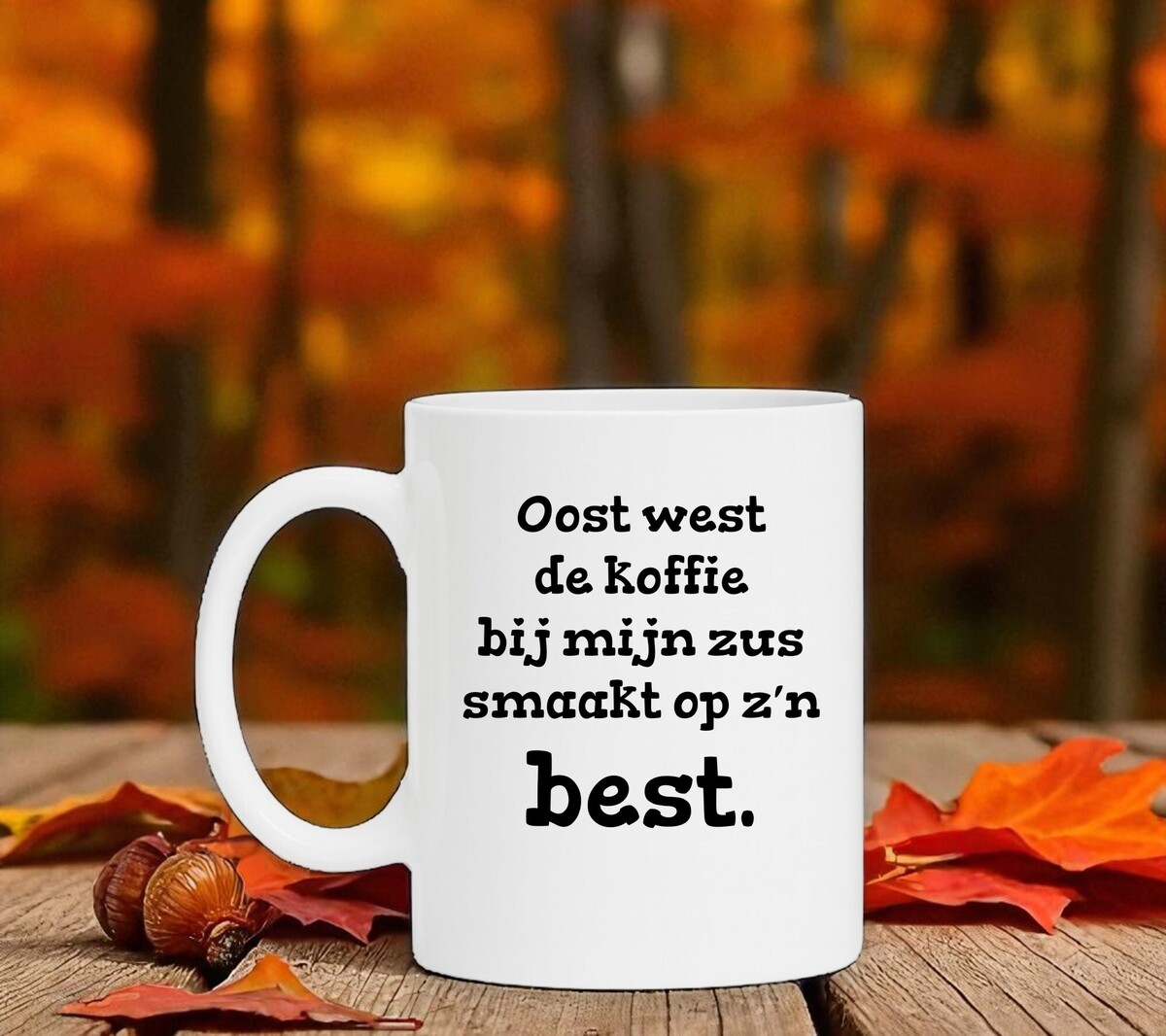 Mok Oost west de koffie bij mijn zus smaakt op z'n best. De witte koffie of thee mok is vaatwasserbestendig en magnetronbestendig. De mok heeft een hoogte van 96mm en een diameter van 80mm. Leuk om je zus cadeau te doen!