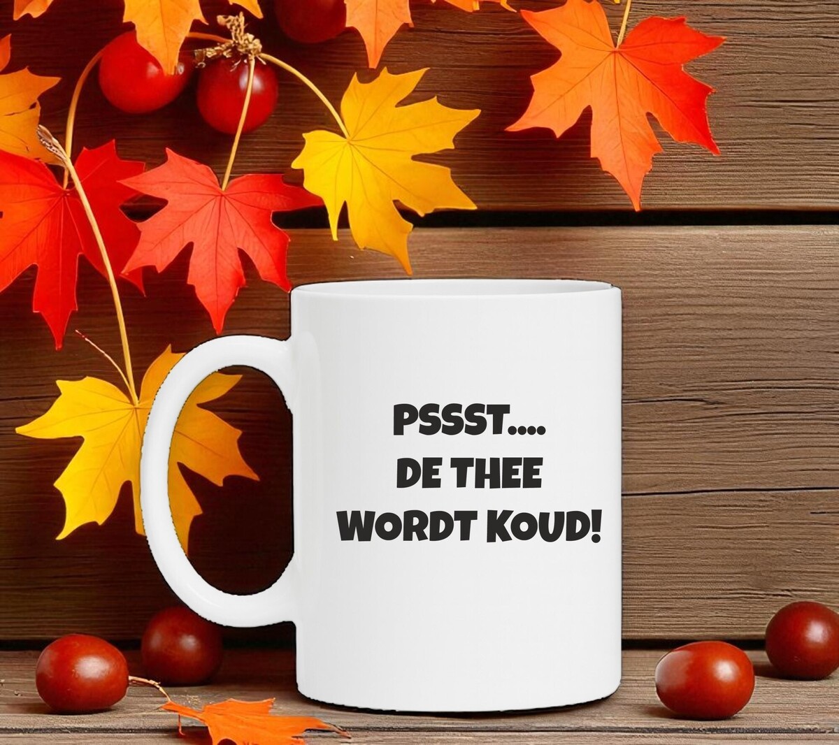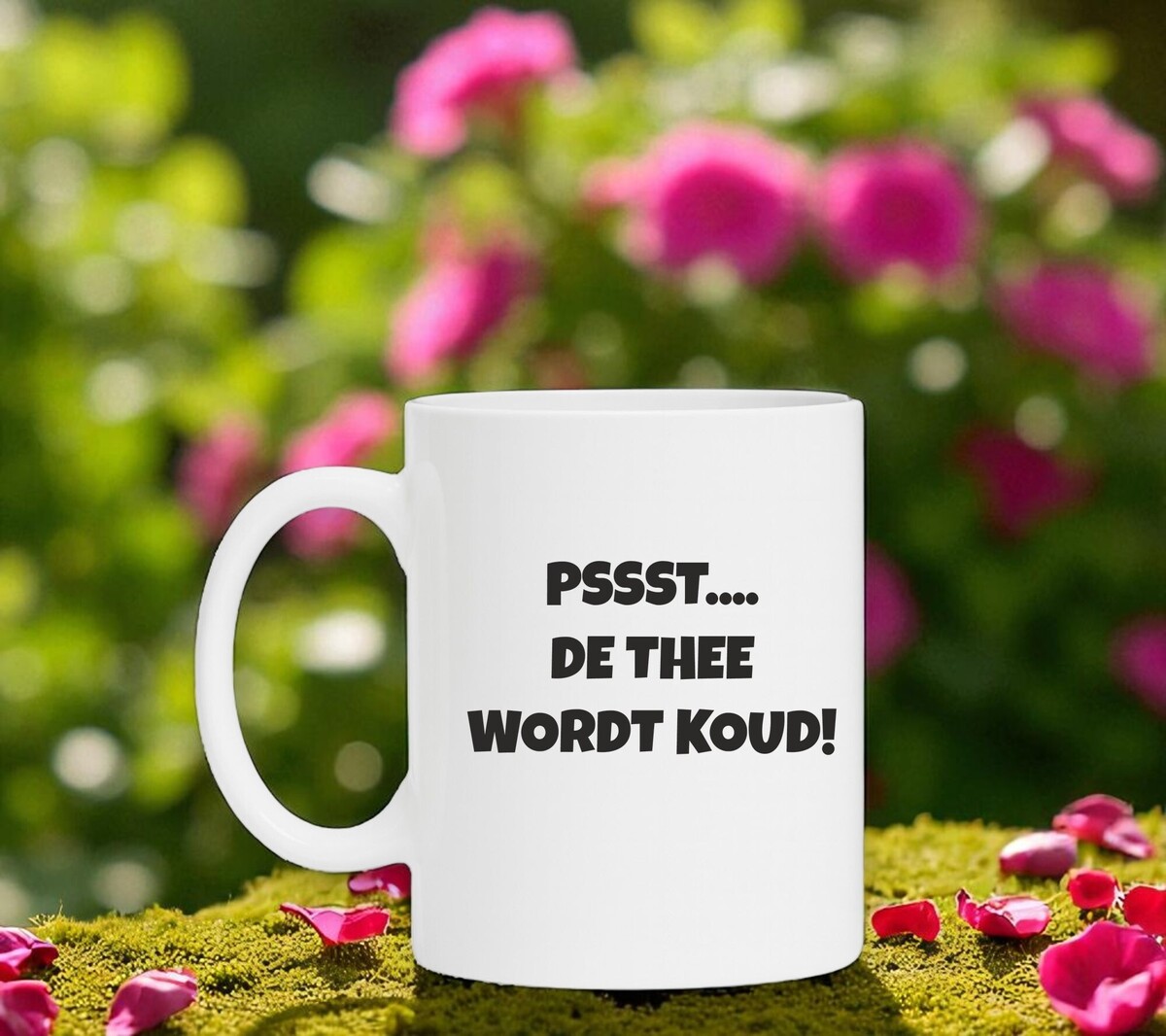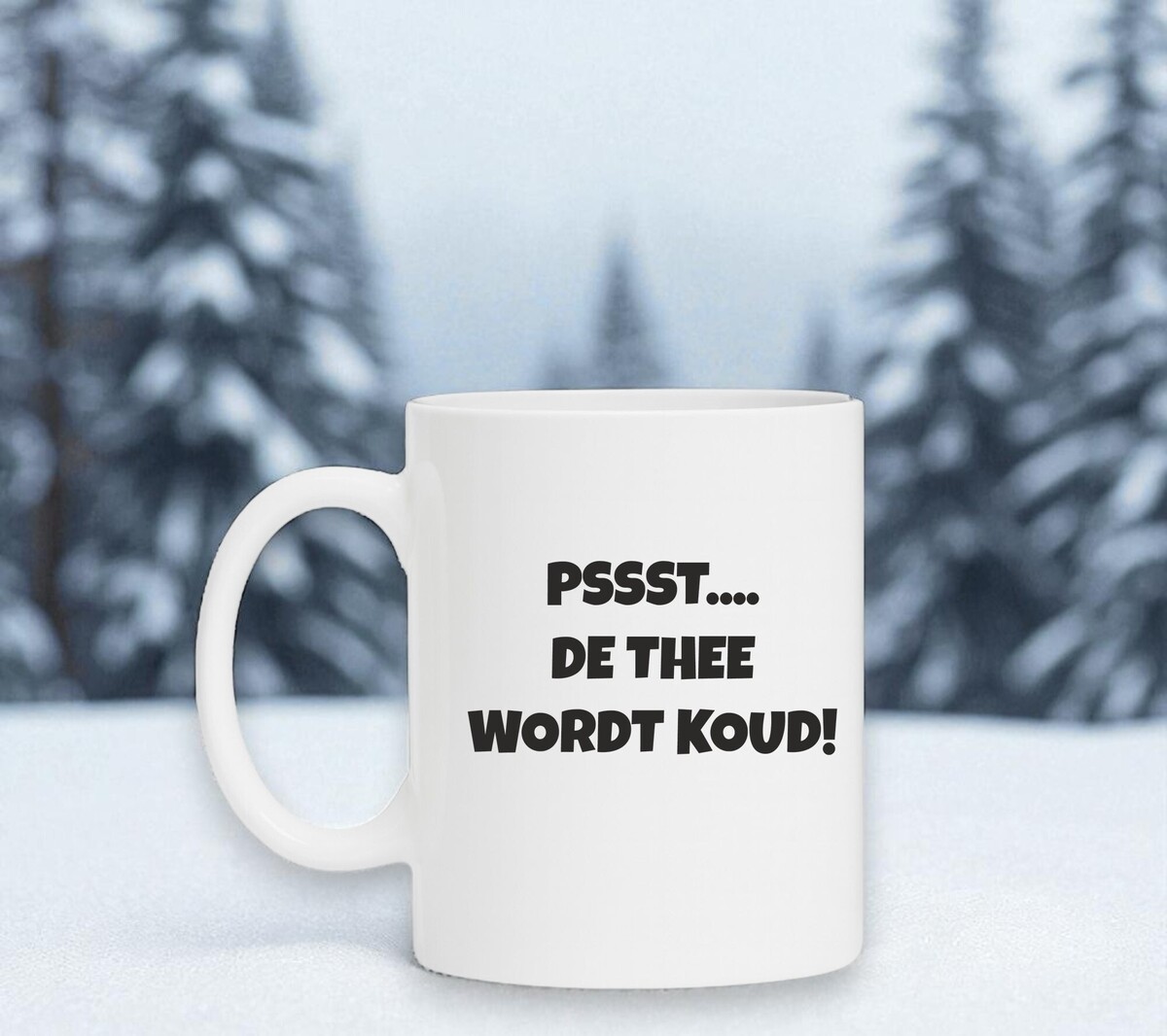 De mok is vaatwasserbestendig en heeft een hoogte van 96mm en een diameter van 80mm. Op deze thee mok staat de opdruk in zwarte letters 'Psst... de thee wordt koud!'.