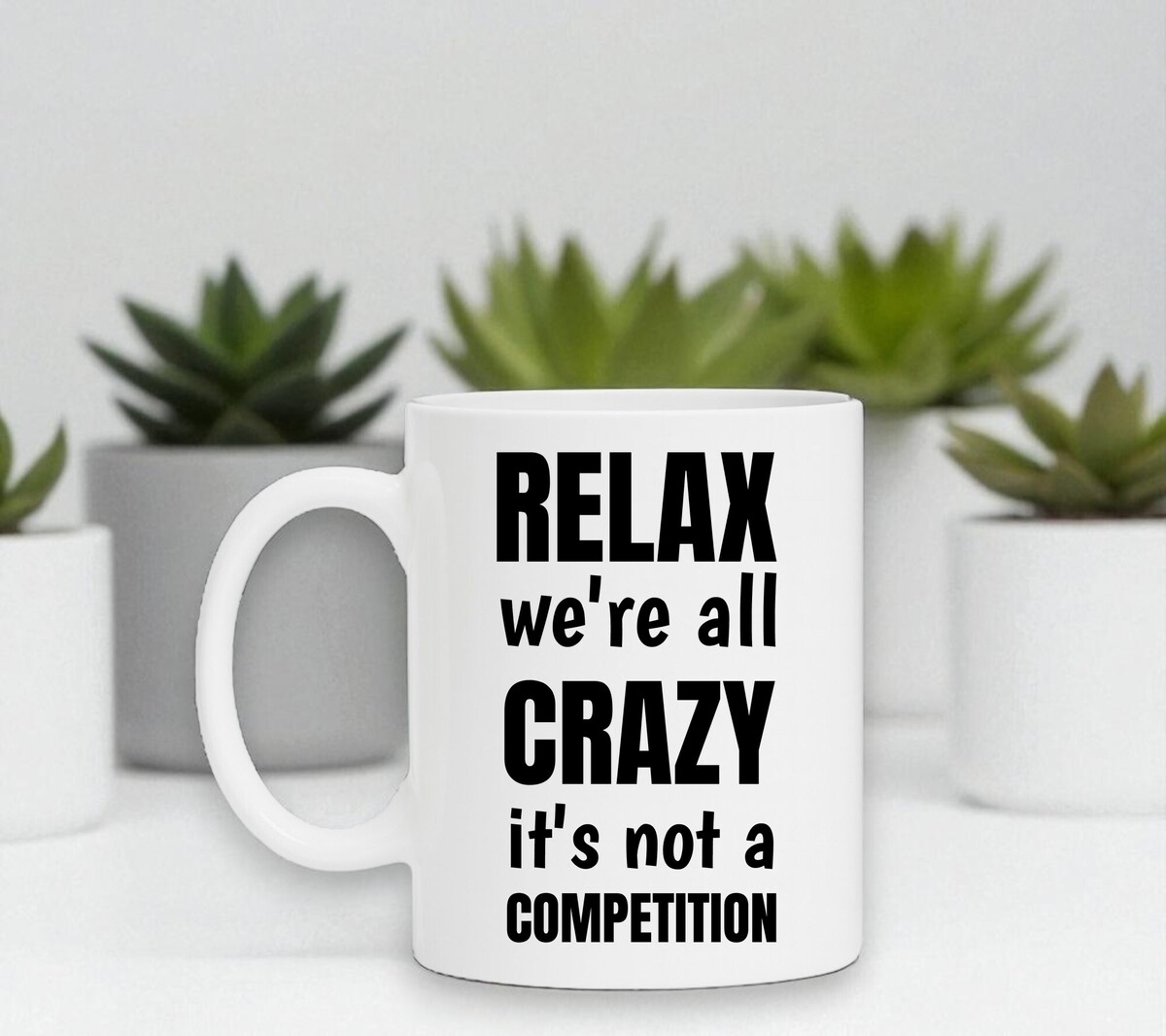 Een witte koffie of thee mok met de opdruk in grote zwarte letters 'Relax we're all crazy it's not a competition'. De mok is magnetron en vaatwasserbestendig en de witte mok heeft een hoogte van 96mm en een diameter van 80mm.