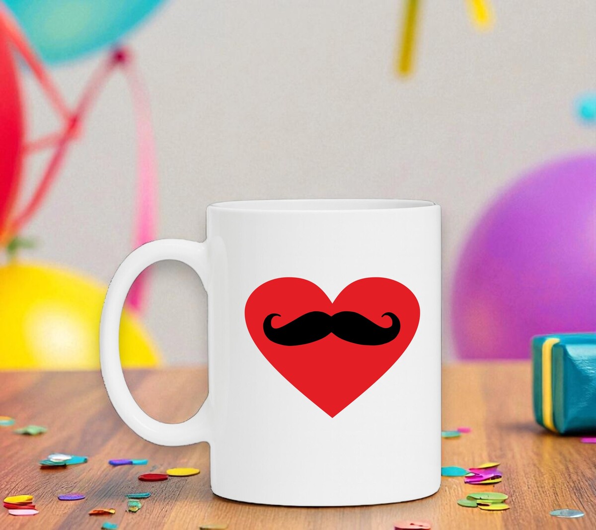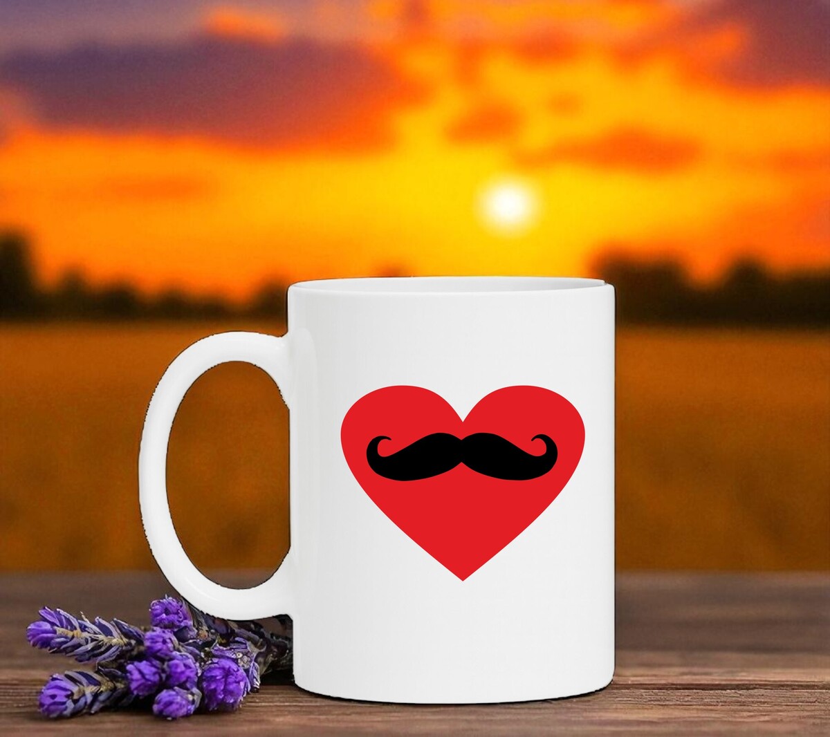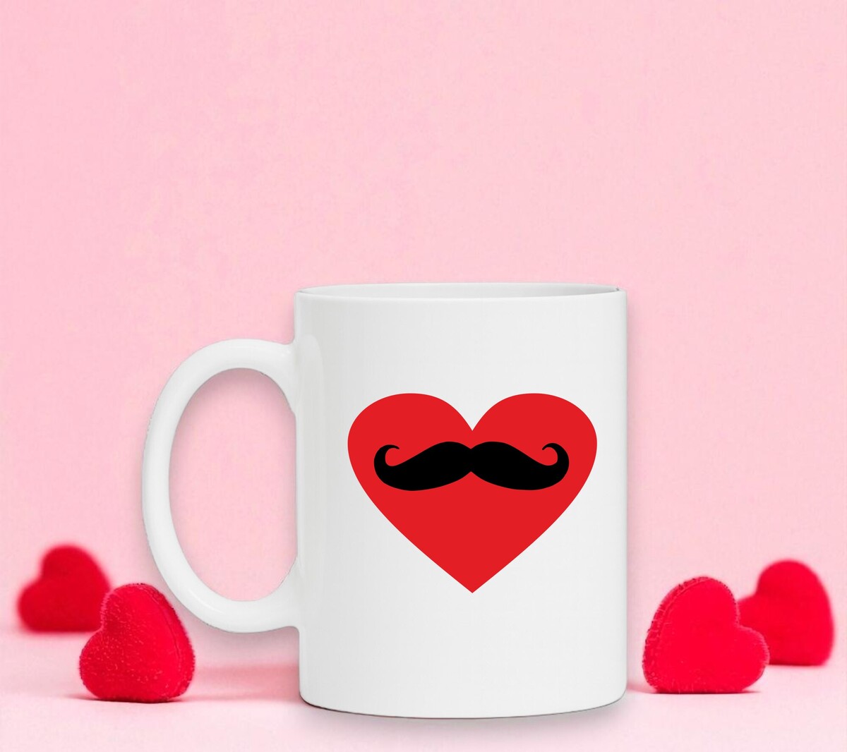 Een mooie witte mok met een rood hart en daarin een snor getekend.