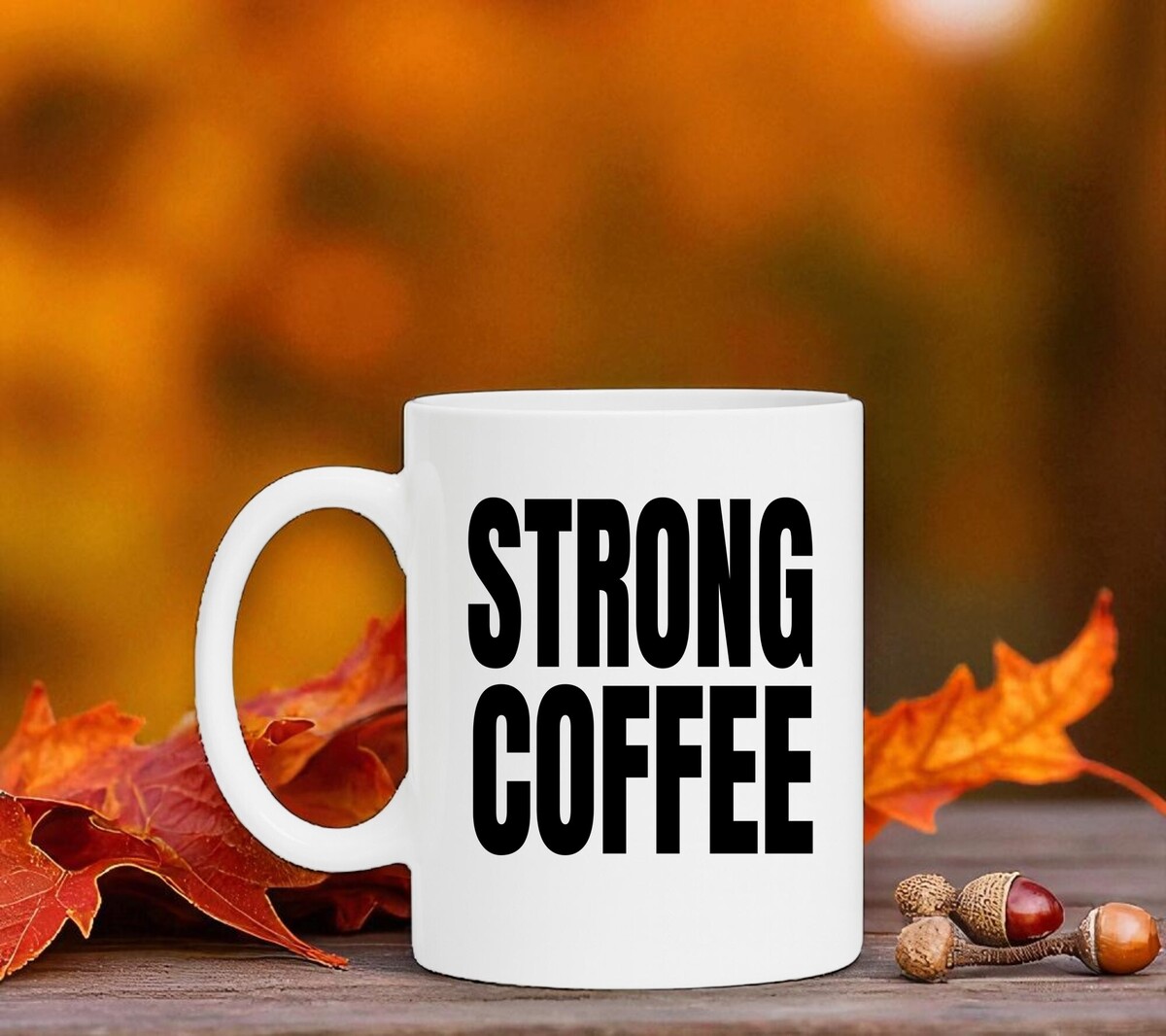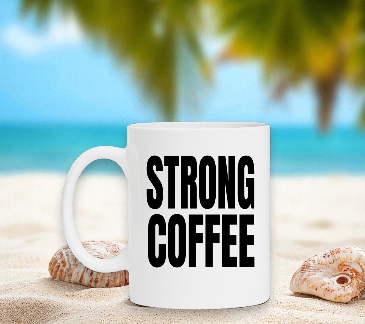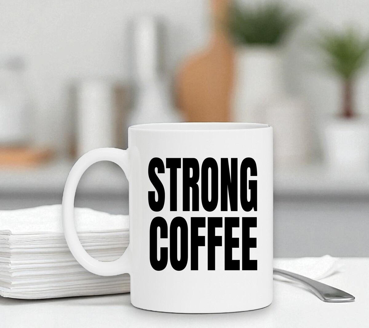 Een koffiemok met de opdruk 'strong coffee'. De mok is 9cm hoog.