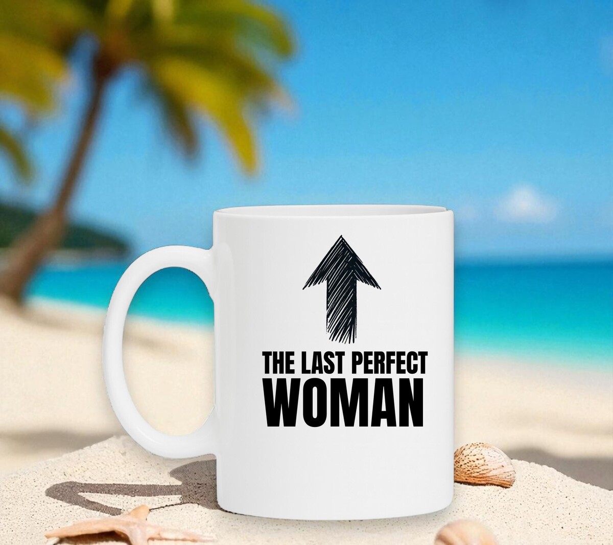 Grappig koffie of thee mok met de opdruk 'The last perfect woman'. De mok is magnetron en vaatwasserbestendig en de witte mok heeft een hoogte van 96mm en een diameter van 80mm.