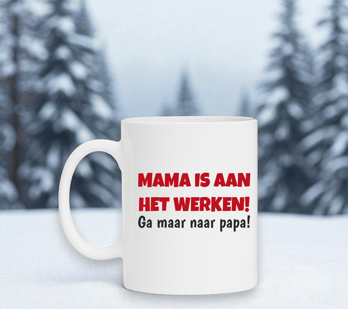 De mok voor moeders die moeten thuiswerken en knettergek worden! Op deze thuiswerk koffie of thee mok staat de tekst 'Mama is aan het werk! ga maar naar papa!'. De mok is magnetron en vaatwasserbestendig en de witte mok heeft een hoogte van 96mm en een diameter van 80mm.