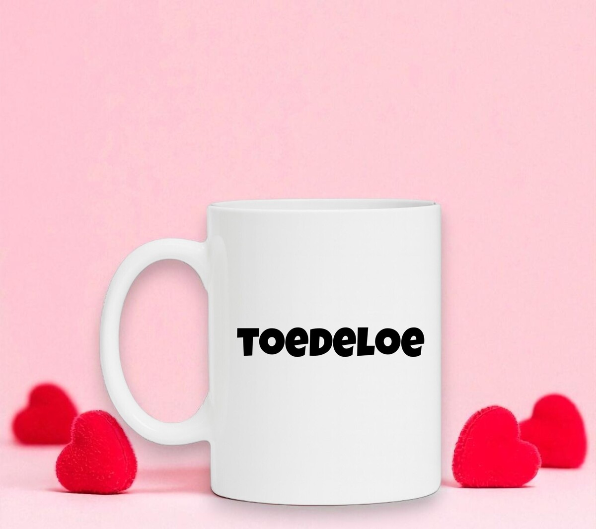 Witte koffie mok met het woord toedeloe erop gedrukt in zwarte letters. De mok is magnetron en vaatwasserbestendig en de witte mok heeft een hoogte van 96mm en een diameter van 80mm.