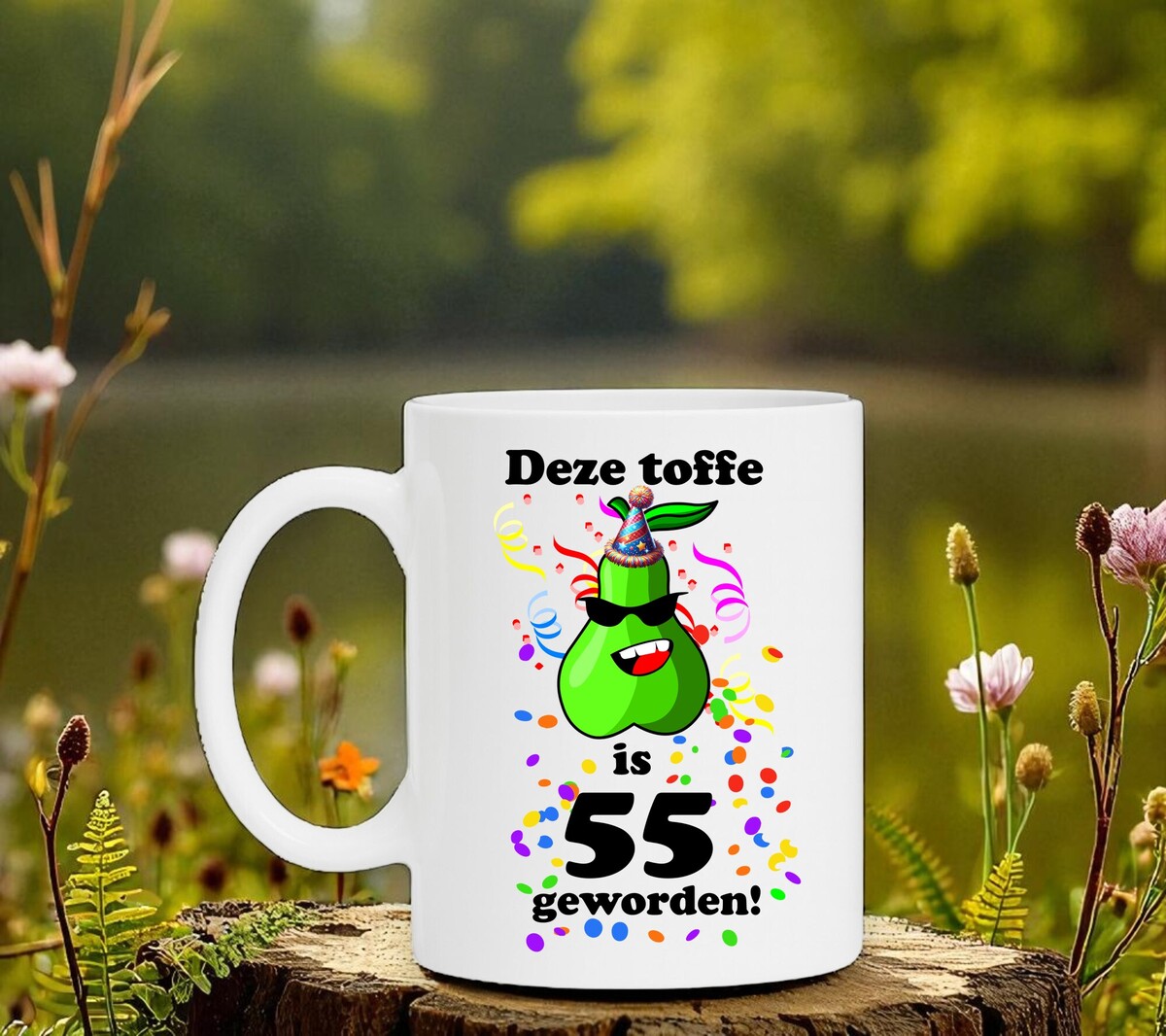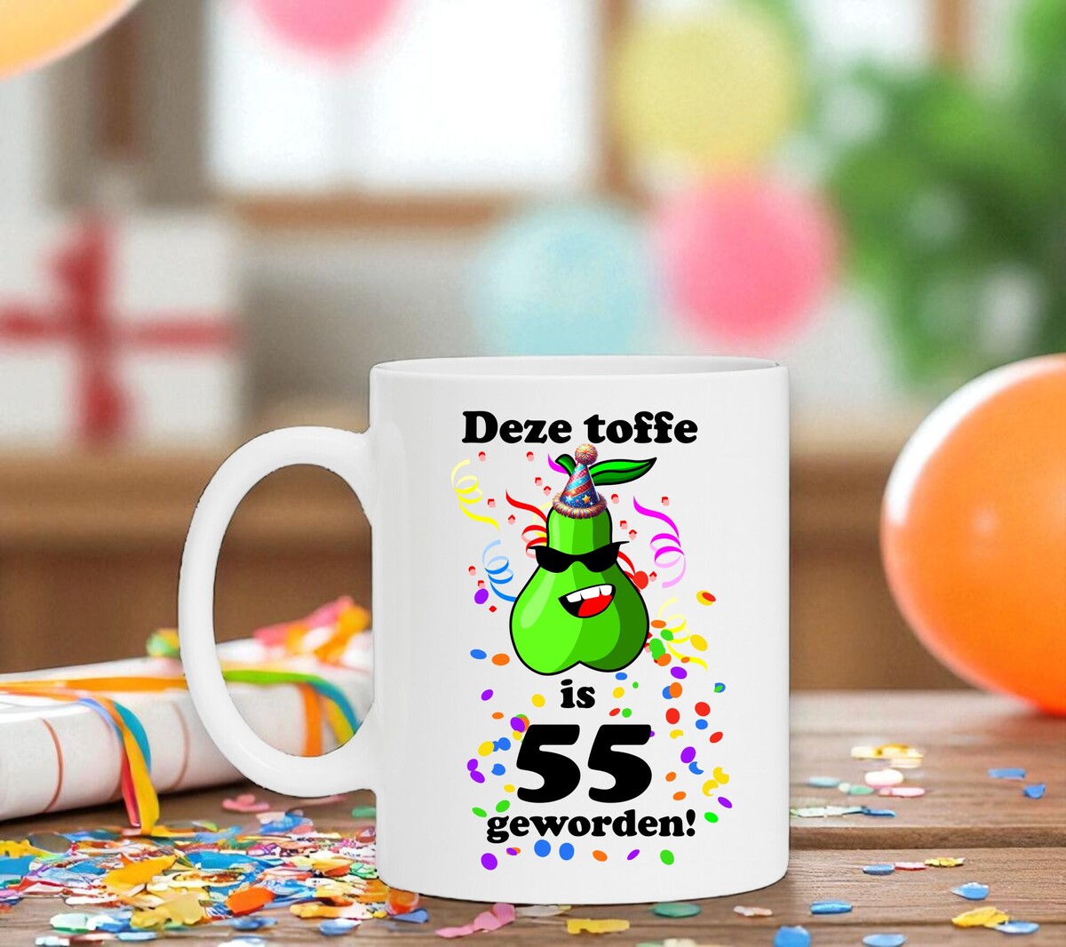 Op deze full colour mok staat de leuke tekst en print: Deze toffe peer is 55 geworden.