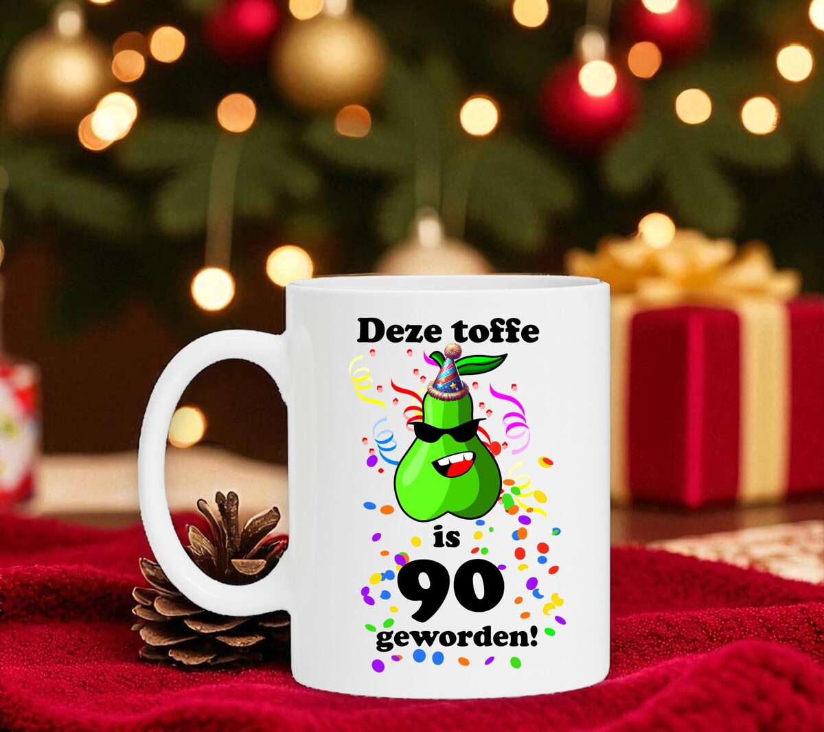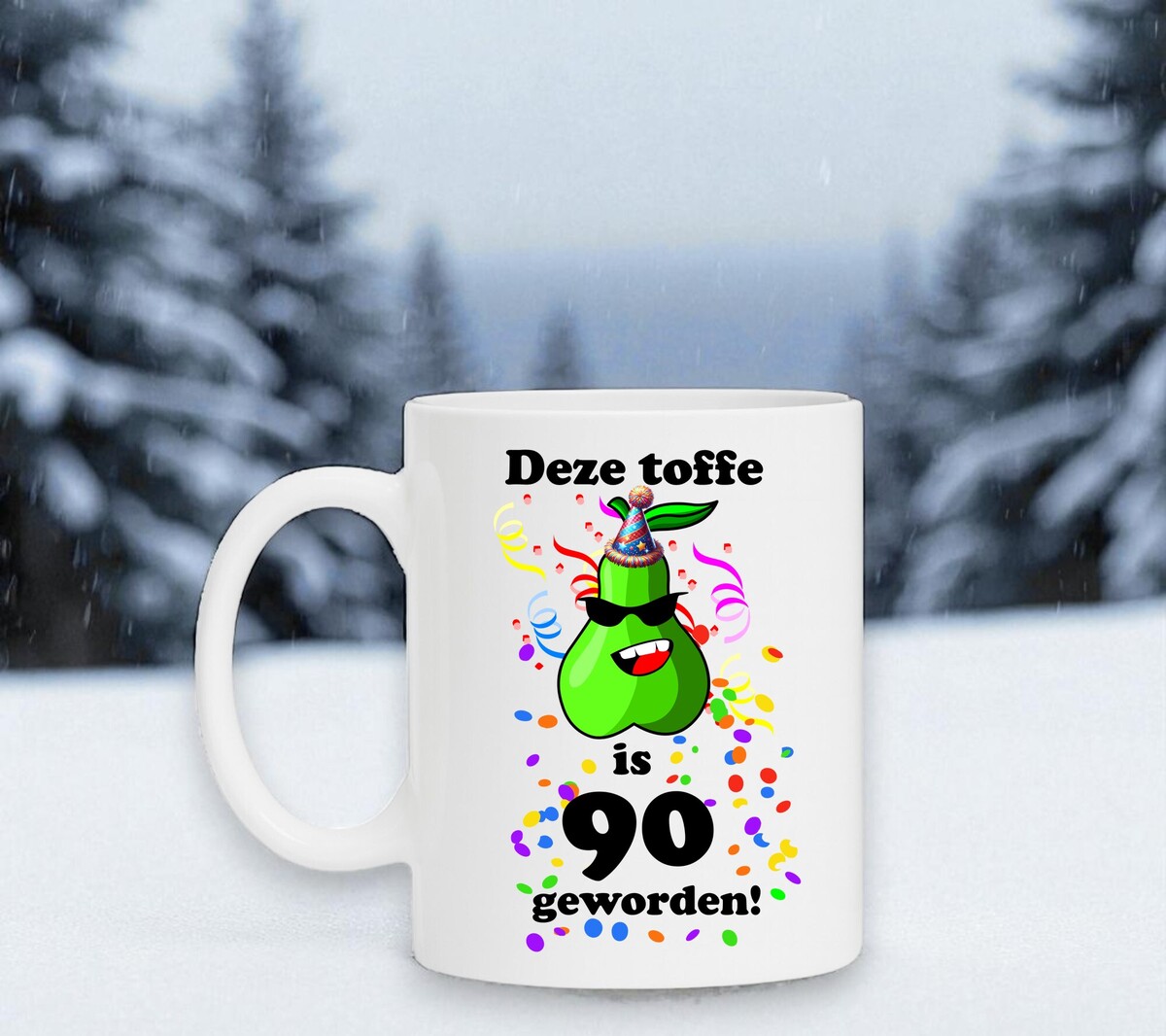 Deze leuke mok is een grappig cadeau voor een man of vrouw die jij tof vindt en zijn of haar 90e verjaardag viert.