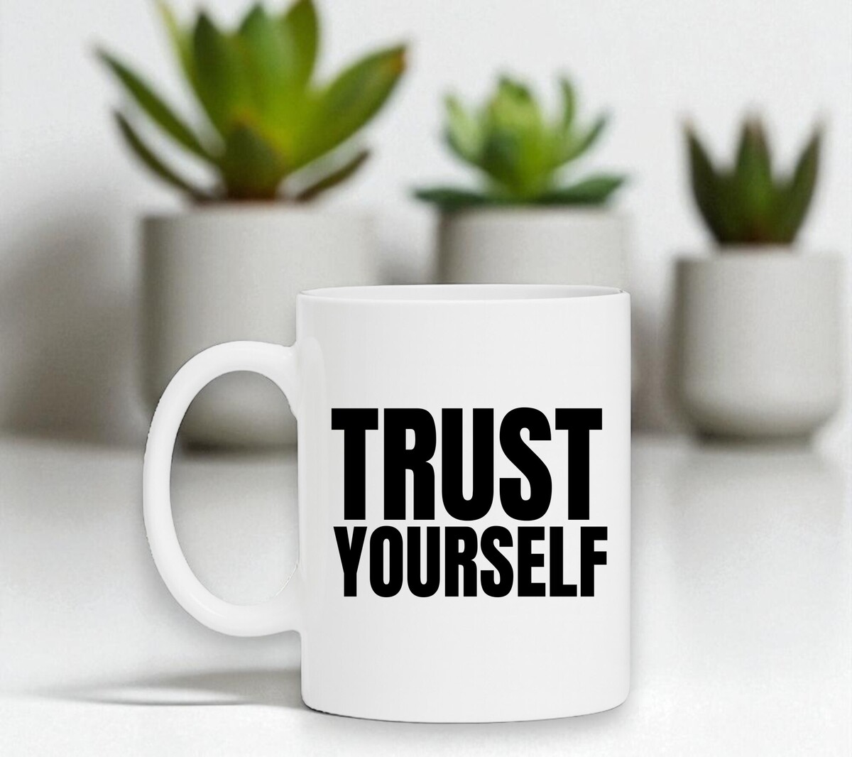 Een witte koffie of thee mok met de opdruk 'Trust yourself'. De mok is magnetron en vaatwasserbestendig en de witte mok heeft een hoogte van 96mm en een diameter van 80mm.
