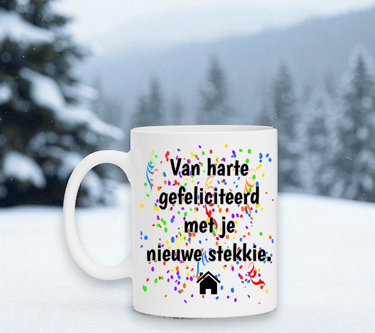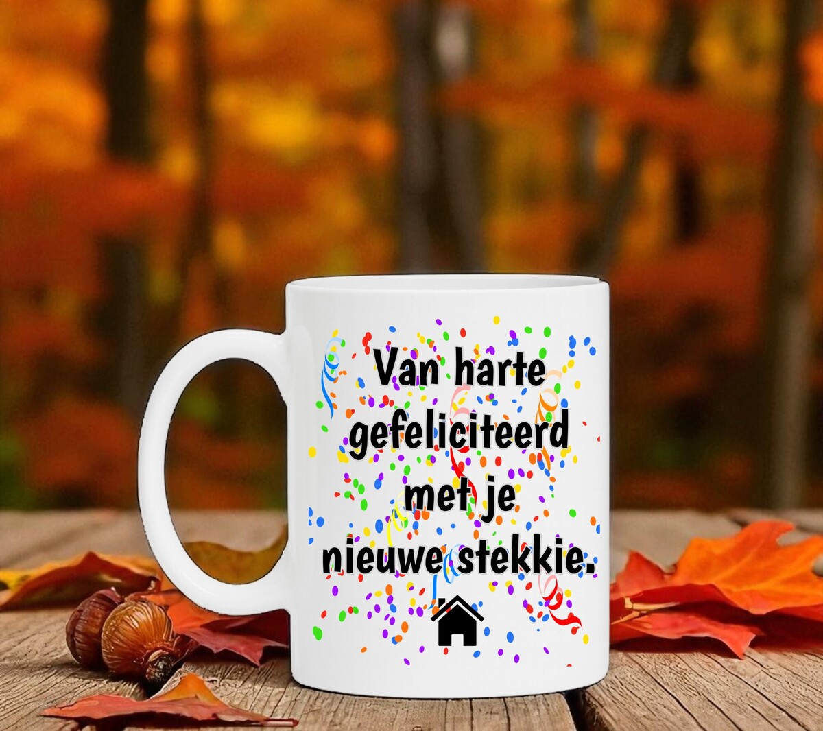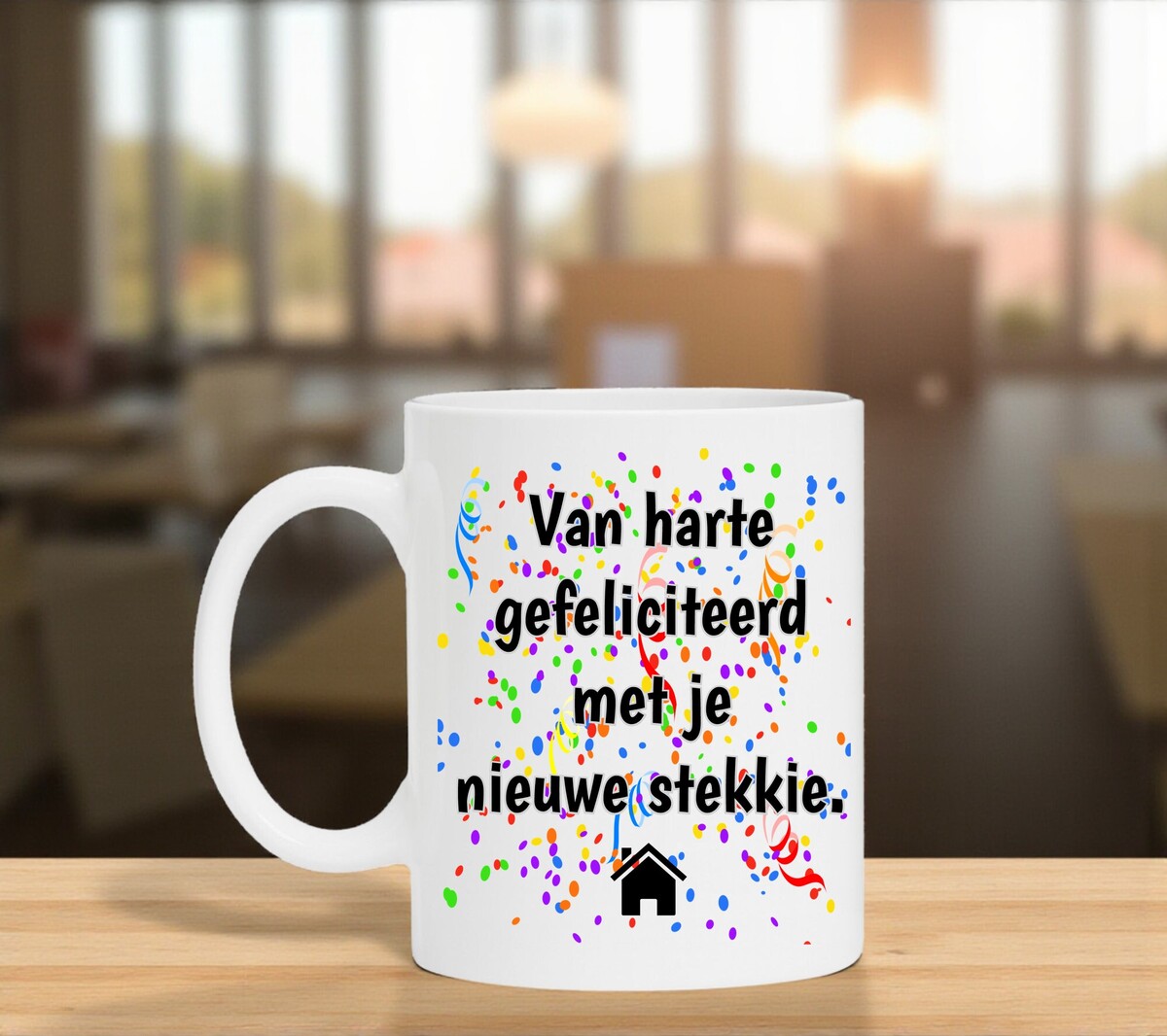 Leuk kadootje voor hem of haar die net een nieuwe woning heeft. Op de mok staat de opdruk 'Van harte gefeliciteerd met je nieuwe stekkie'. De mok is magnetron en vaatwasserbestendig en de witte mok heeft een hoogte van 96mm en een diameter van 80mm.