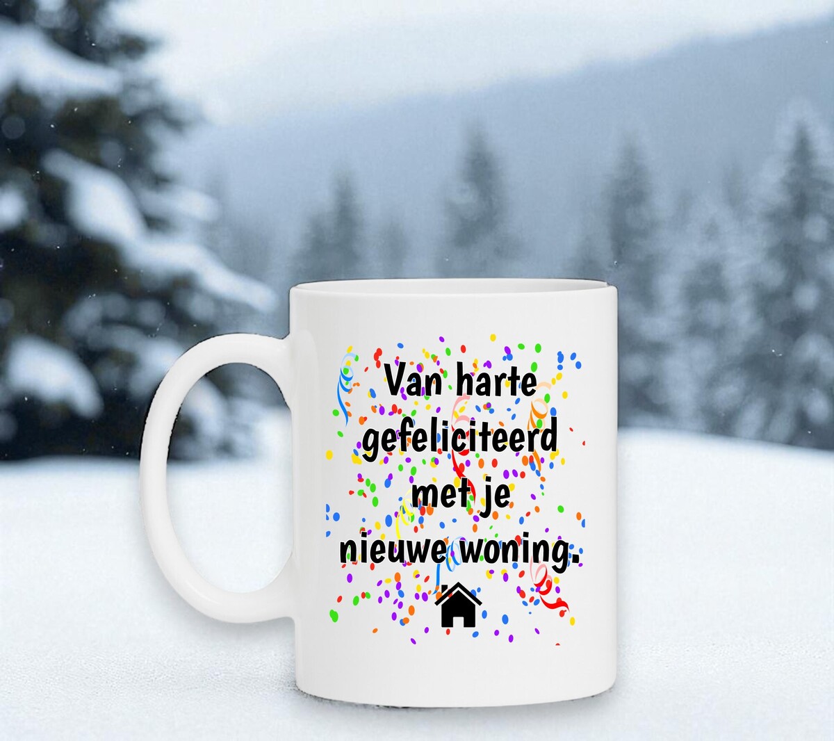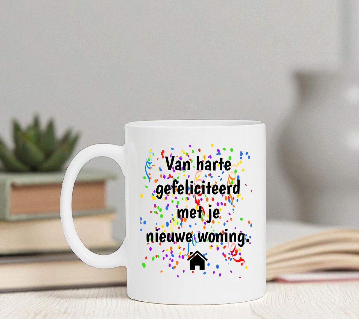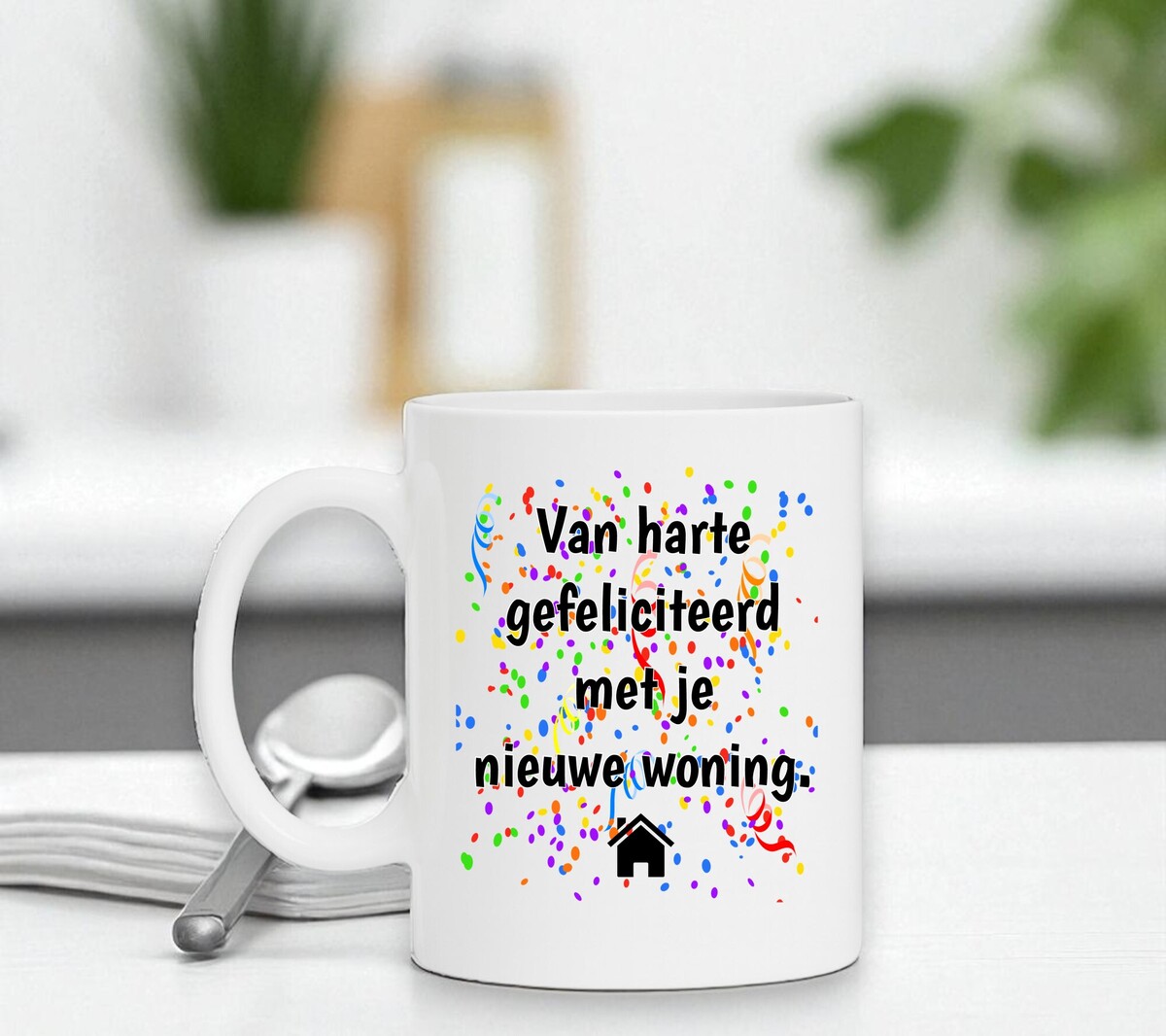 Een leuk cadeau voor hem of haar die net is verhuisd naar een nieuwe woning. Op de mok staat de op druk in een feestelijk print van harte gefeliciteerd met je nieuwe woning. De mok is magnetron en vaatwasserbestendig en de witte mok heeft een hoogte van 96mm en een diameter van 80mm.