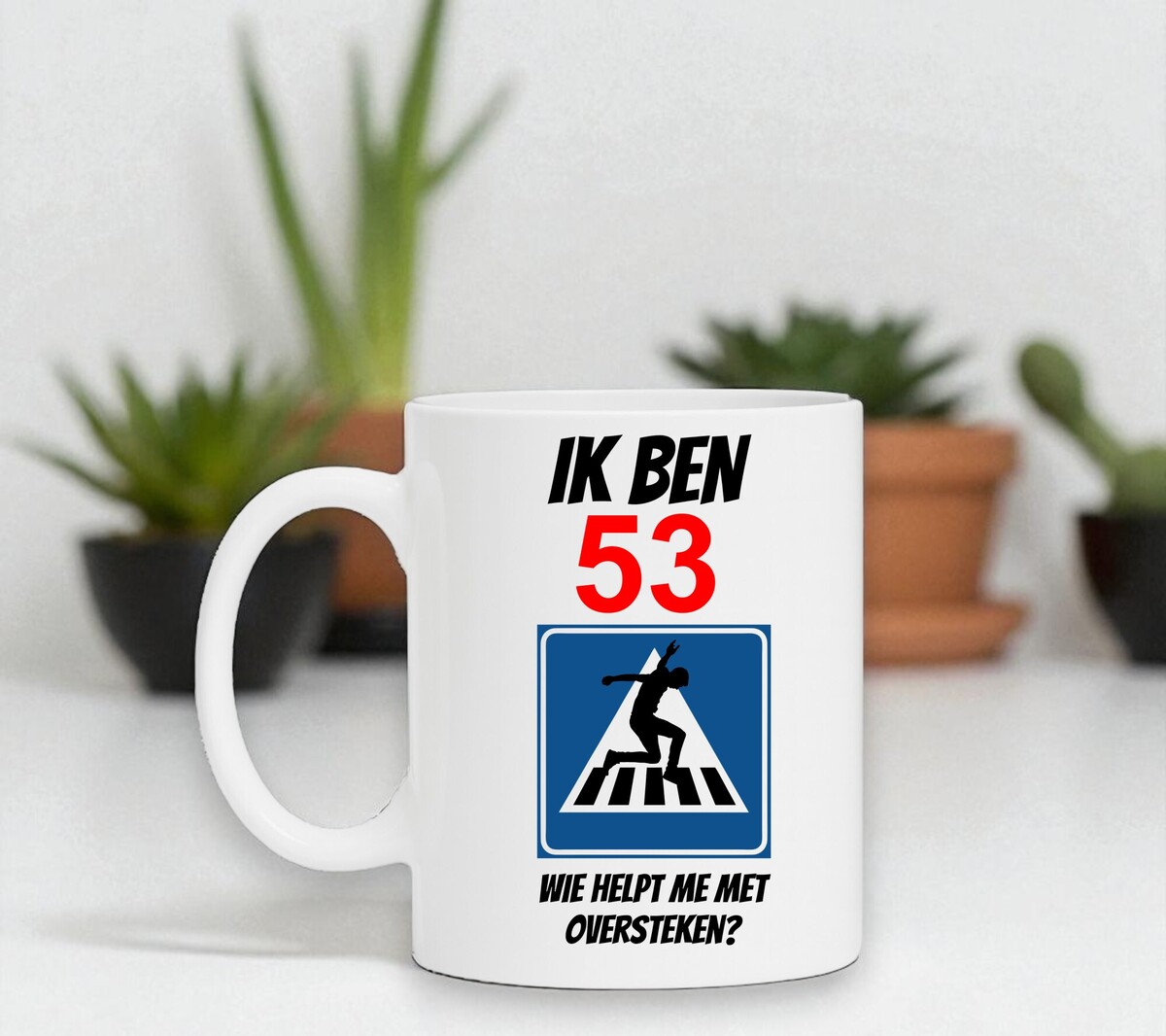 Humoristiche mok met de leuke tekst: ik ben 53 wie helpt me met oversteken?