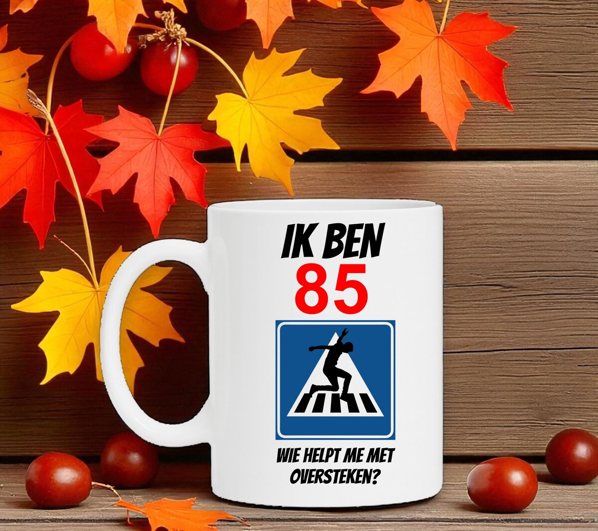 Op deze full colour mok staat de grappige tekst: ik ben 85 wie helpt me oversteken?