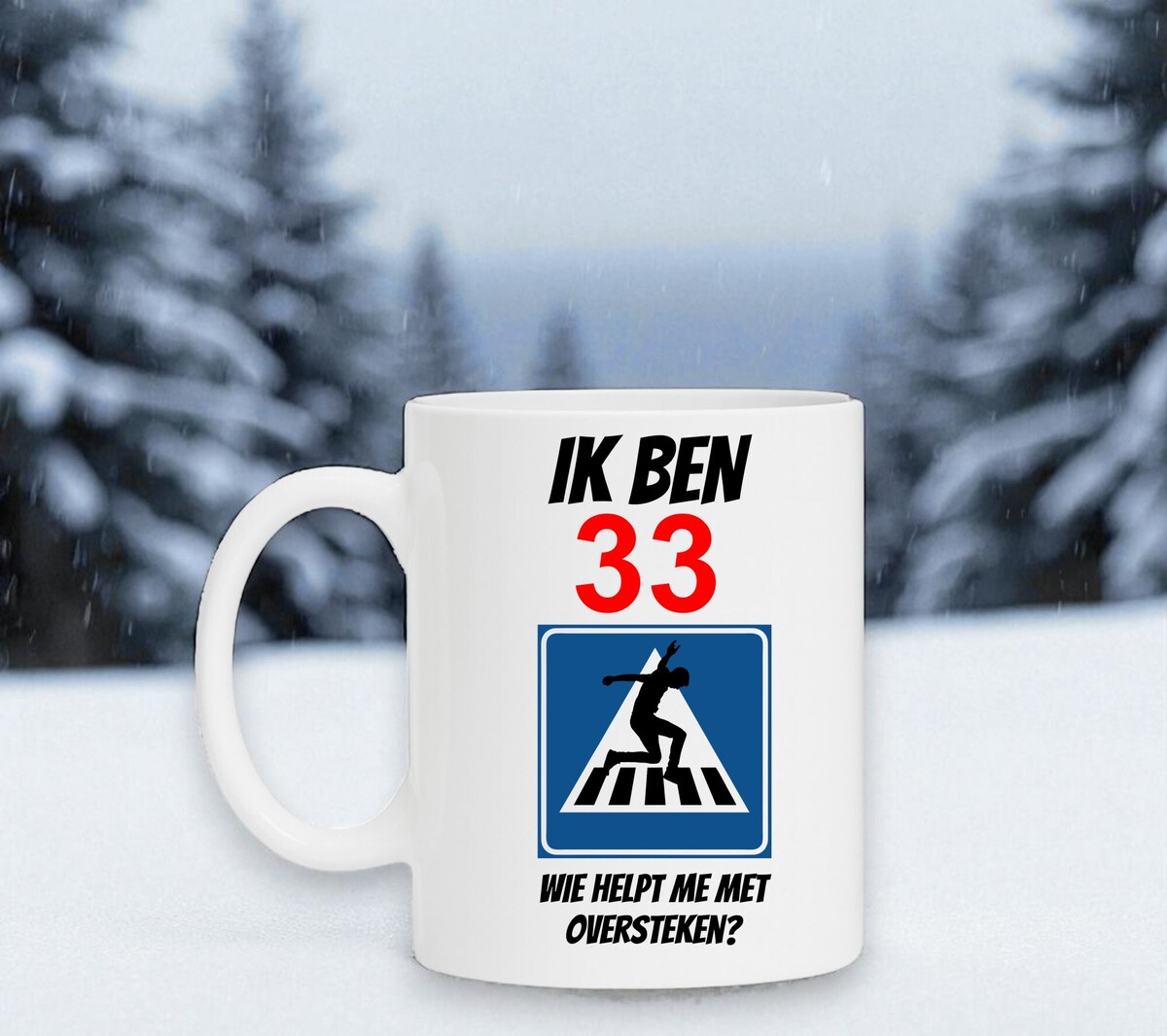 Wanneer je een leuk en grappig cadeau zoekt voor een 33ste verjaardag dan is deze full colour mok zeker een aanrader. Op deze mok staat de grappige tekst: ik ben 33 jaar wie helpt me met oversteken?