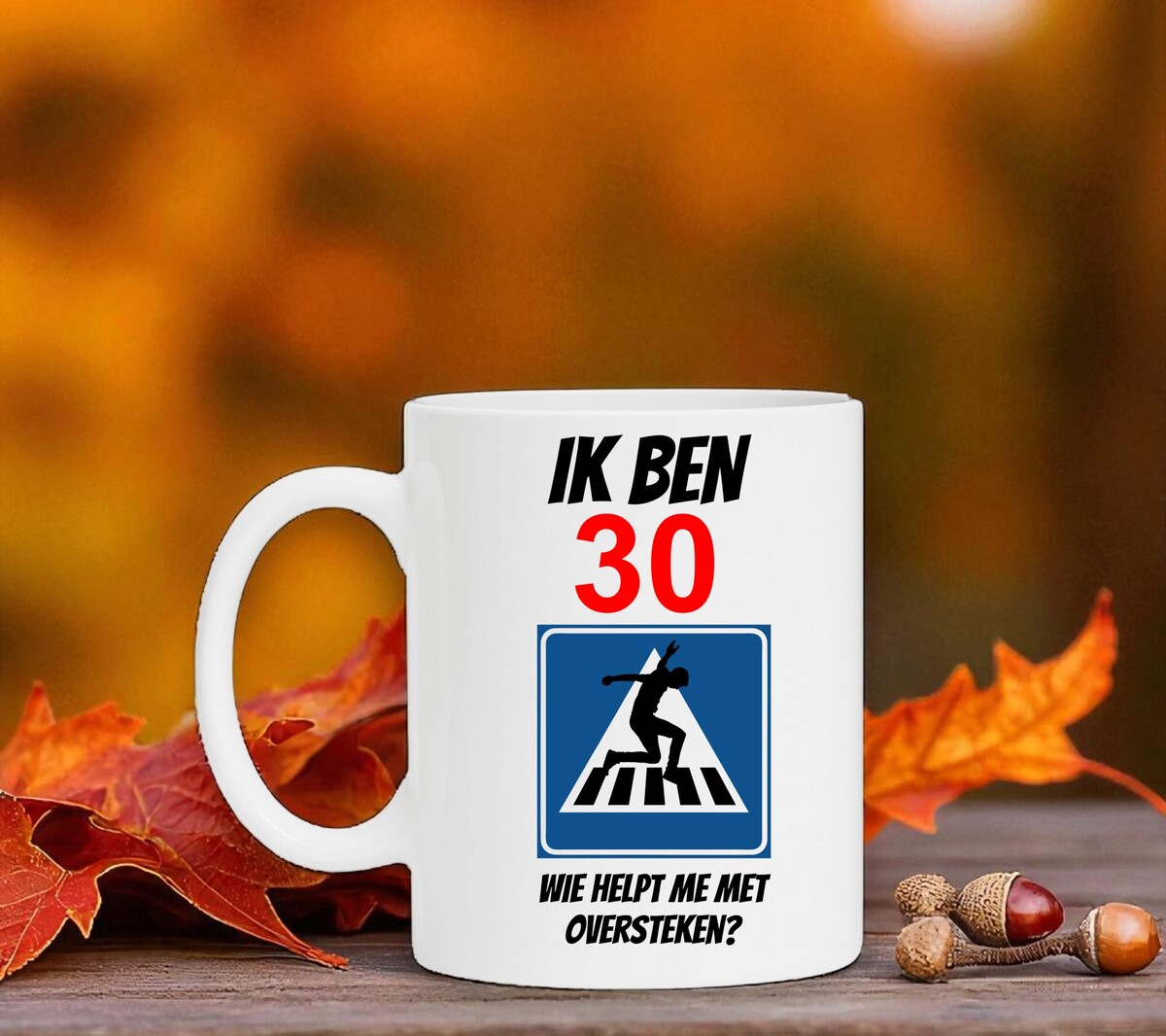 Op deze full colour mok staat de grappige tekst: ik ben 30 wie helpt me met oversteken?