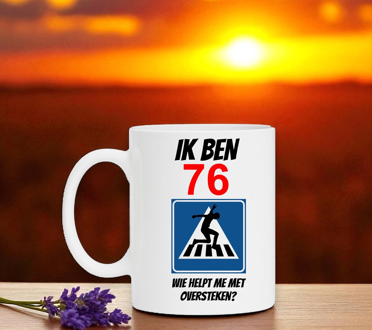 Op zoek naar een leuke mok voor een verjaardag van 76 jaar? Dan is deze mok zeker een aanrader. Op deze mok staat de humoristische tekst: ik ben 76 wie helpt me oversteken?