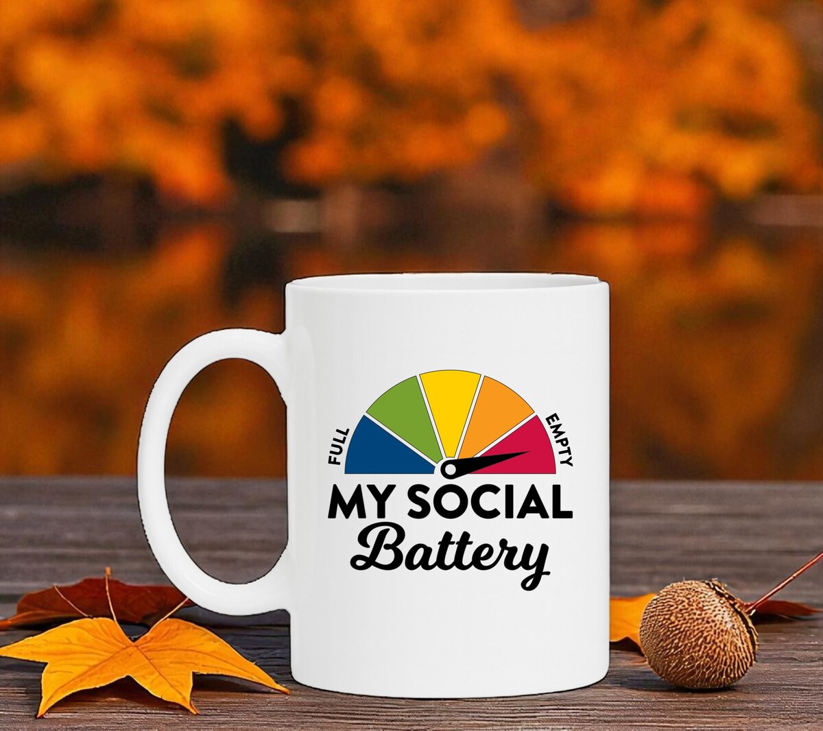 Mok voor collega's waarvan de sociale batterij leeg is! De witte koffie of thee mok is vaatwasserbestendig en magnetronbestendig. De mok heeft een hoogte van 96mm en een diameter van 80mm.