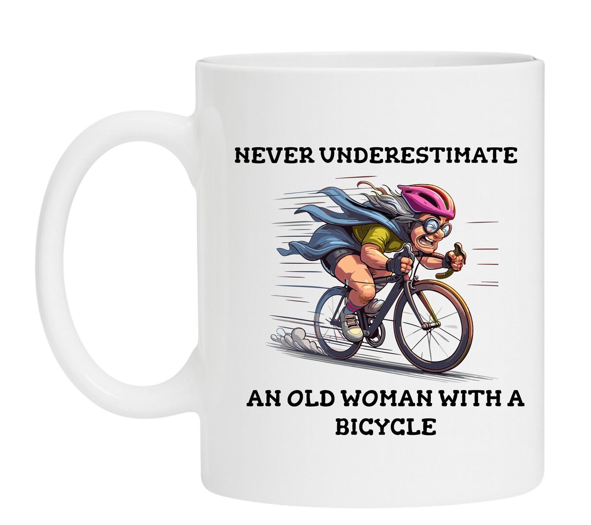 Geef je Ochtend een Boost met onze "Never Underestimate an Old Woman with a Bicycle" Mok!