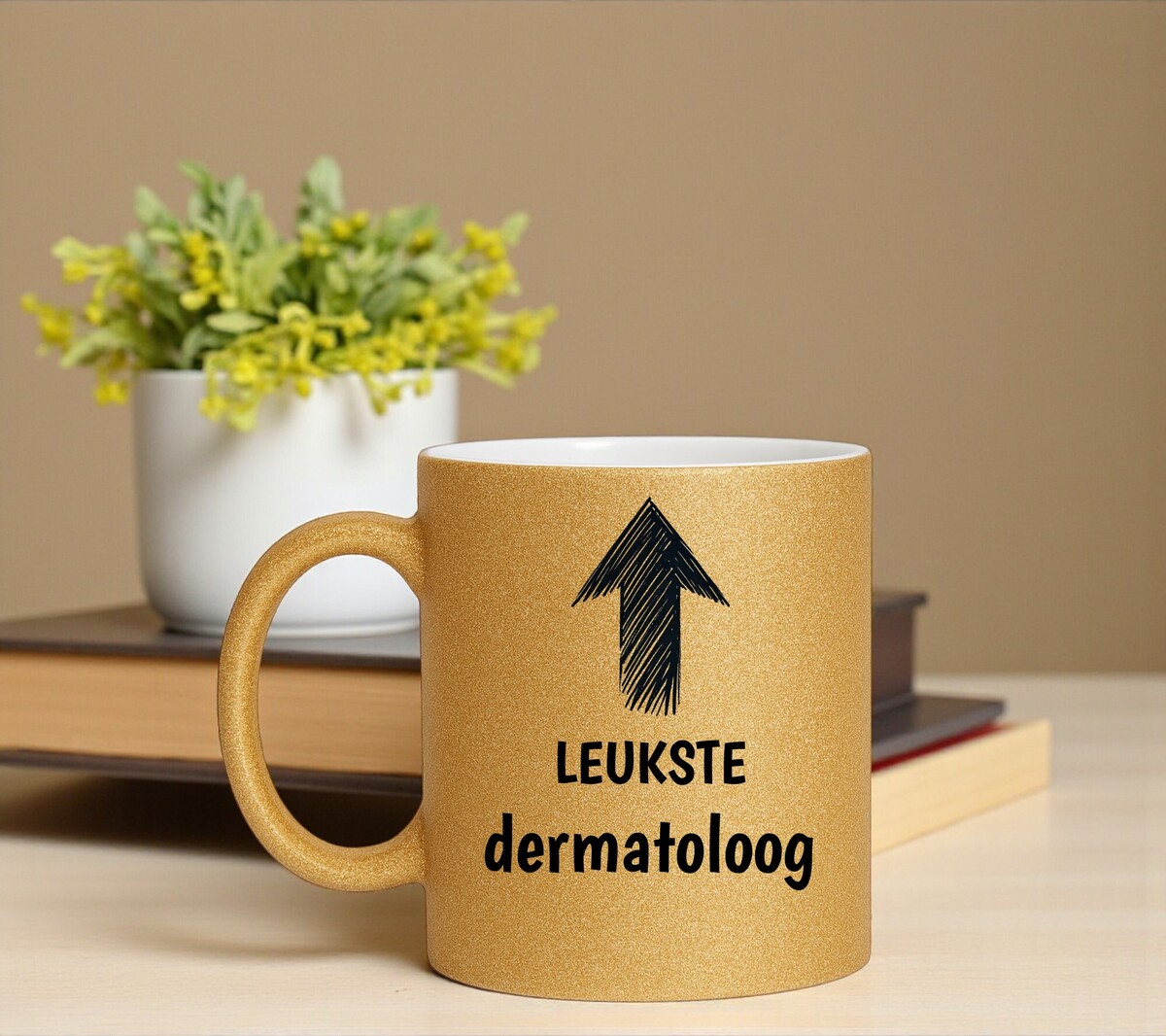 Op deze glitter mok in het goud staat de tekst: leukste dermatoloog.