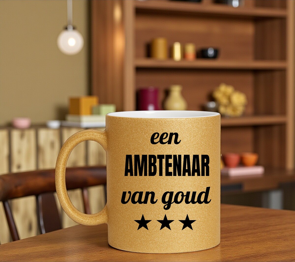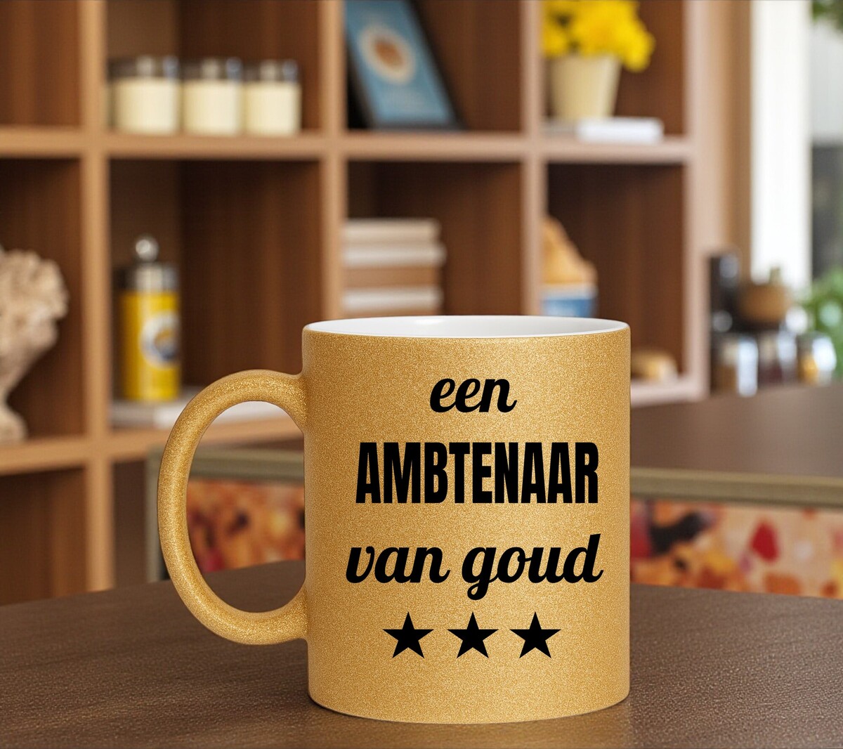 De gouden glittermok heeft een hoogte van 96 mm, een diameter van 80 mm en een inhoud van circa 330 ml. Door de glittercoating is deze mok niet geschikt voor de magnetron en wordt handwas aanbevolen om de opdruk en glans te behouden.