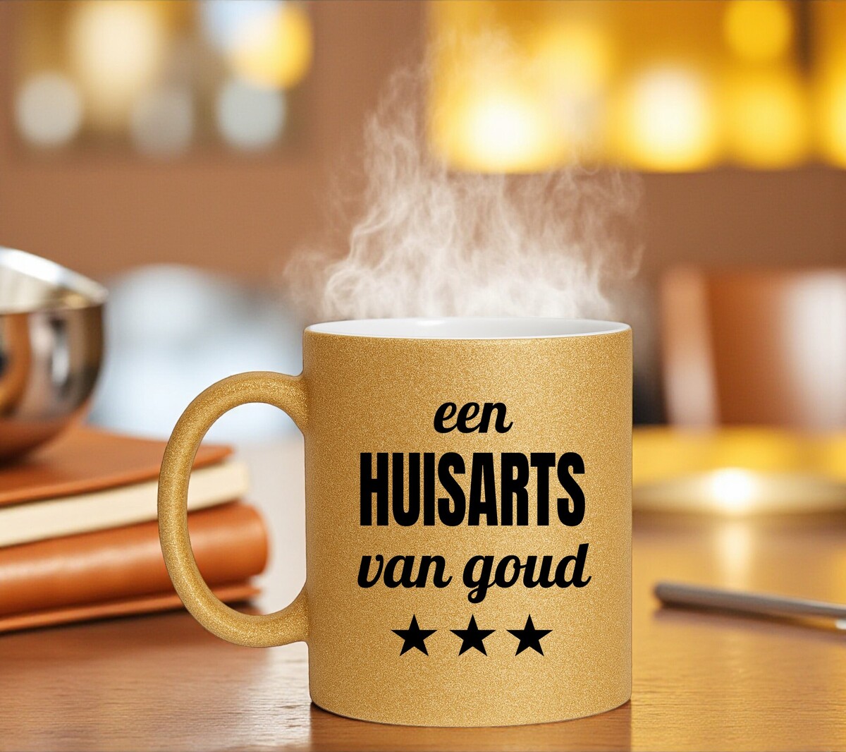 Op deze glitter gouden mok staat de tekst: een huisarts van goud. Handwas aanbevolen! Microgolfbestendig De mok heeft een hoogte van 96mm en een diameter van 80mm.