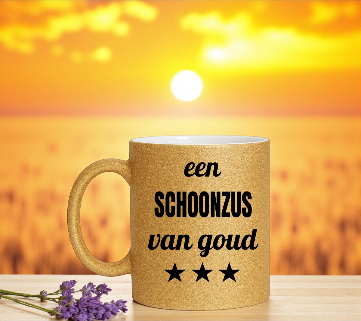 De gouden glittermok heeft een hoogte van 96 mm, een diameter van 80 mm en een inhoud van circa 330 ml. Door de glittercoating is deze mok niet geschikt voor de magnetron en wordt handwas aanbevolen om de opdruk en glans te behouden.