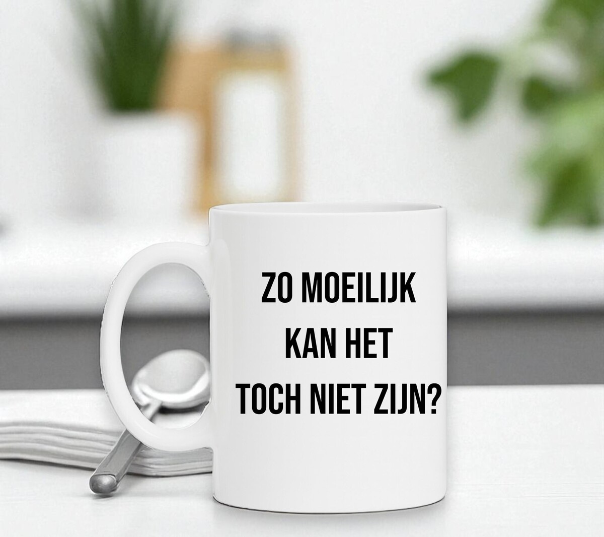 Mok voor op het werk Zo moeilijk kan het toch niet zijn? De witte koffie of thee mok is vaatwasserbestendig en magnetronbestendig. De mok heeft een hoogte van 96mm en een diameter van 80mm.