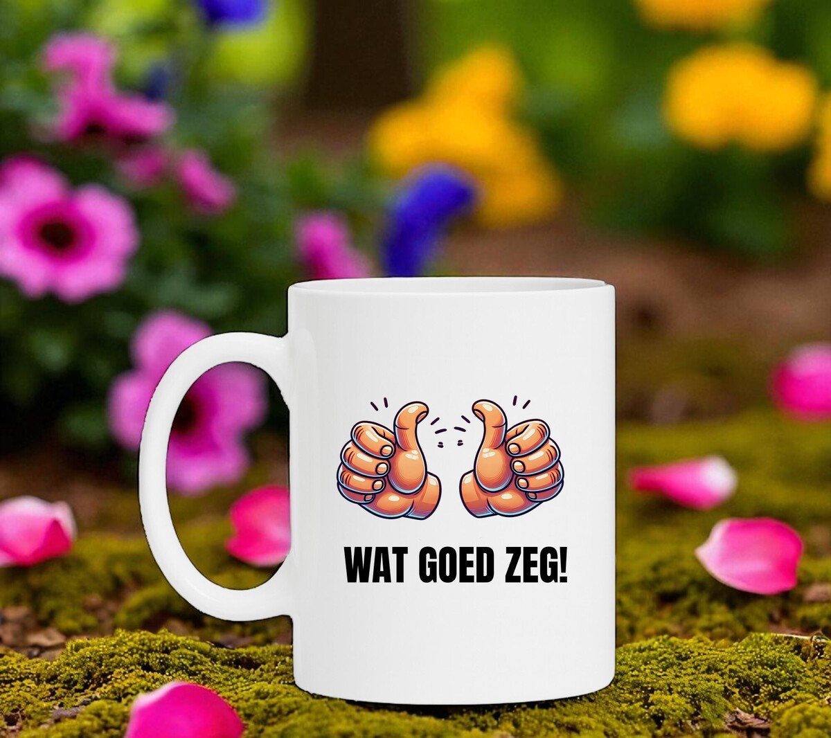 Een super positive koffie of thee mok! Op de witte mok staat de tekst 'Wat goed zeg!'.