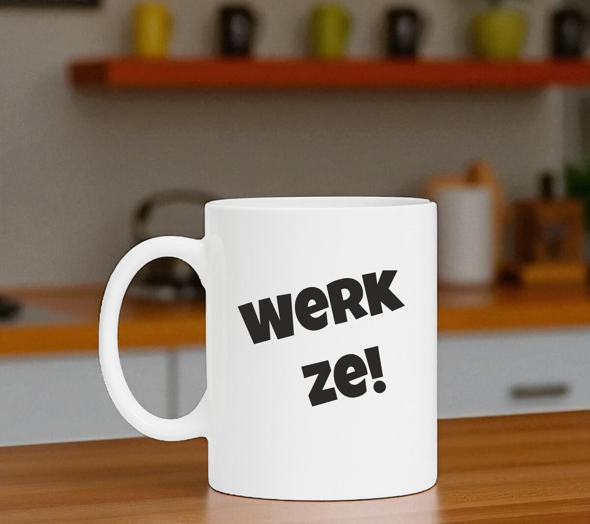Een leuk mok voor op het werk met de tekst werk ze! Ook leuk om je collega kado te geven. De mok is vaatwasserbestendig en magnetronbestendig. De mok heeft een hoogte van 96mm en een diameter van 80mm