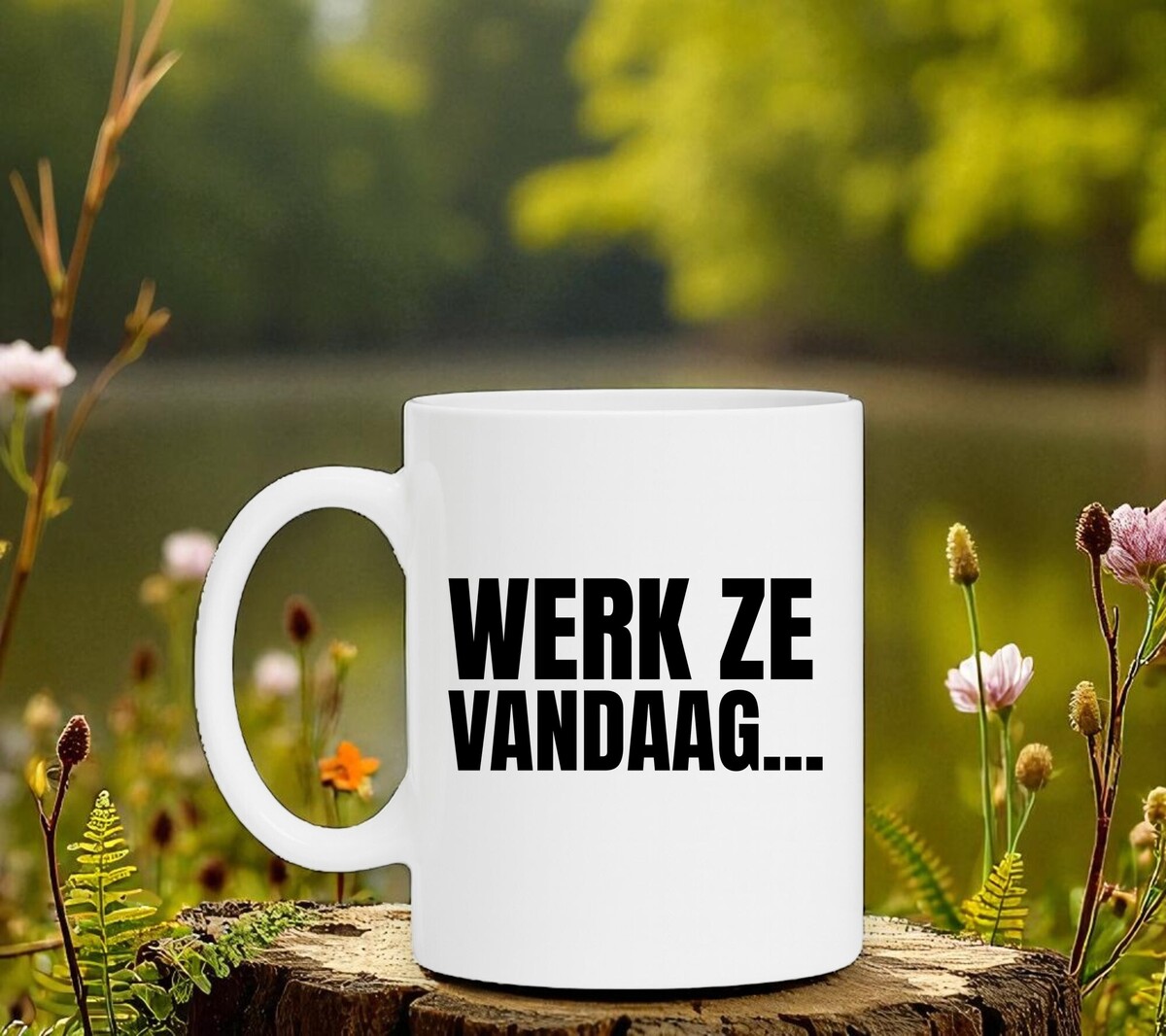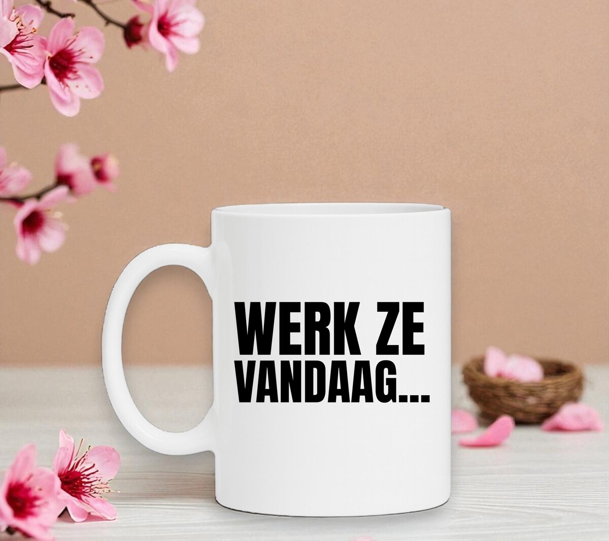 Mok werk ze vandaag zet hem op. De witte koffie of thee mok is vaatwasserbestendig en magnetronbestendig. De mok heeft een hoogte van 96mm en een diameter van 80mm.