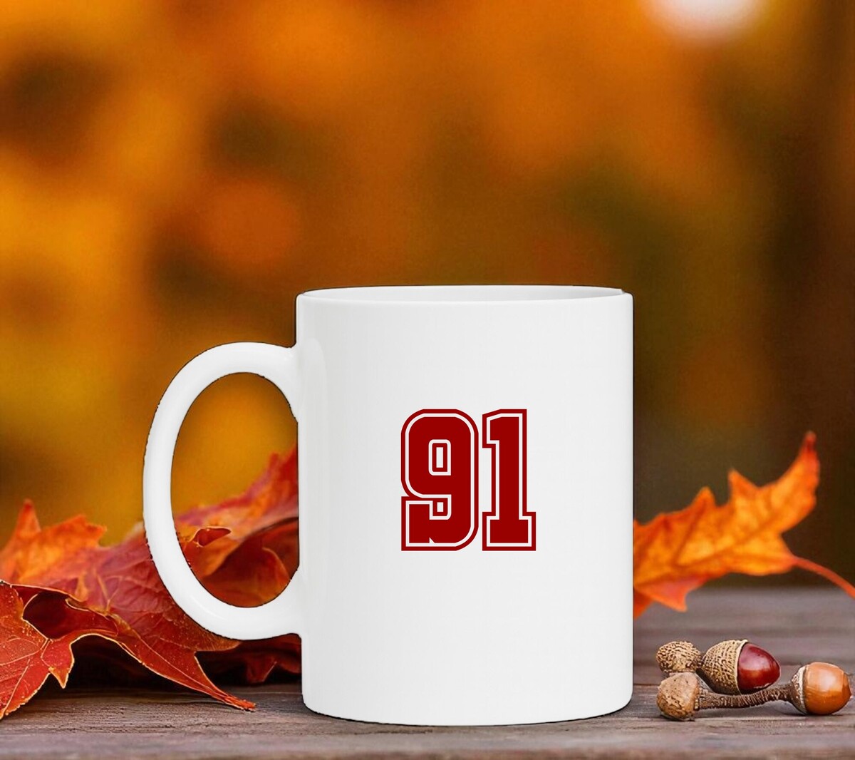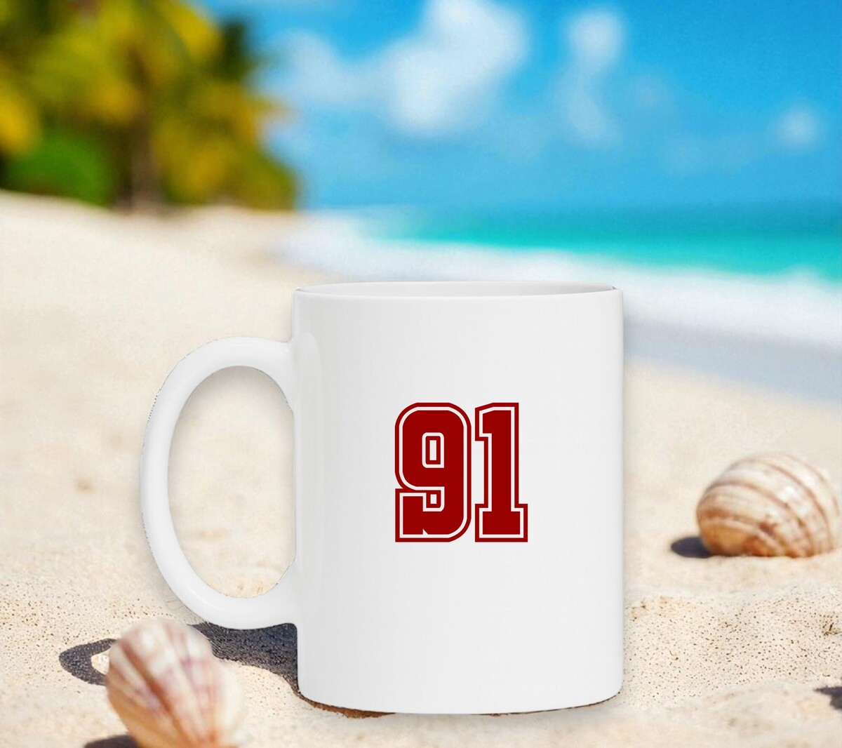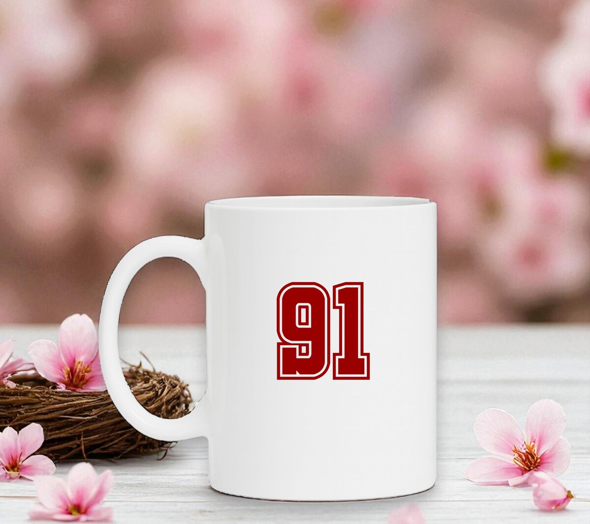 Mok wit cijfer 91 als print in de kleur robijnrood.