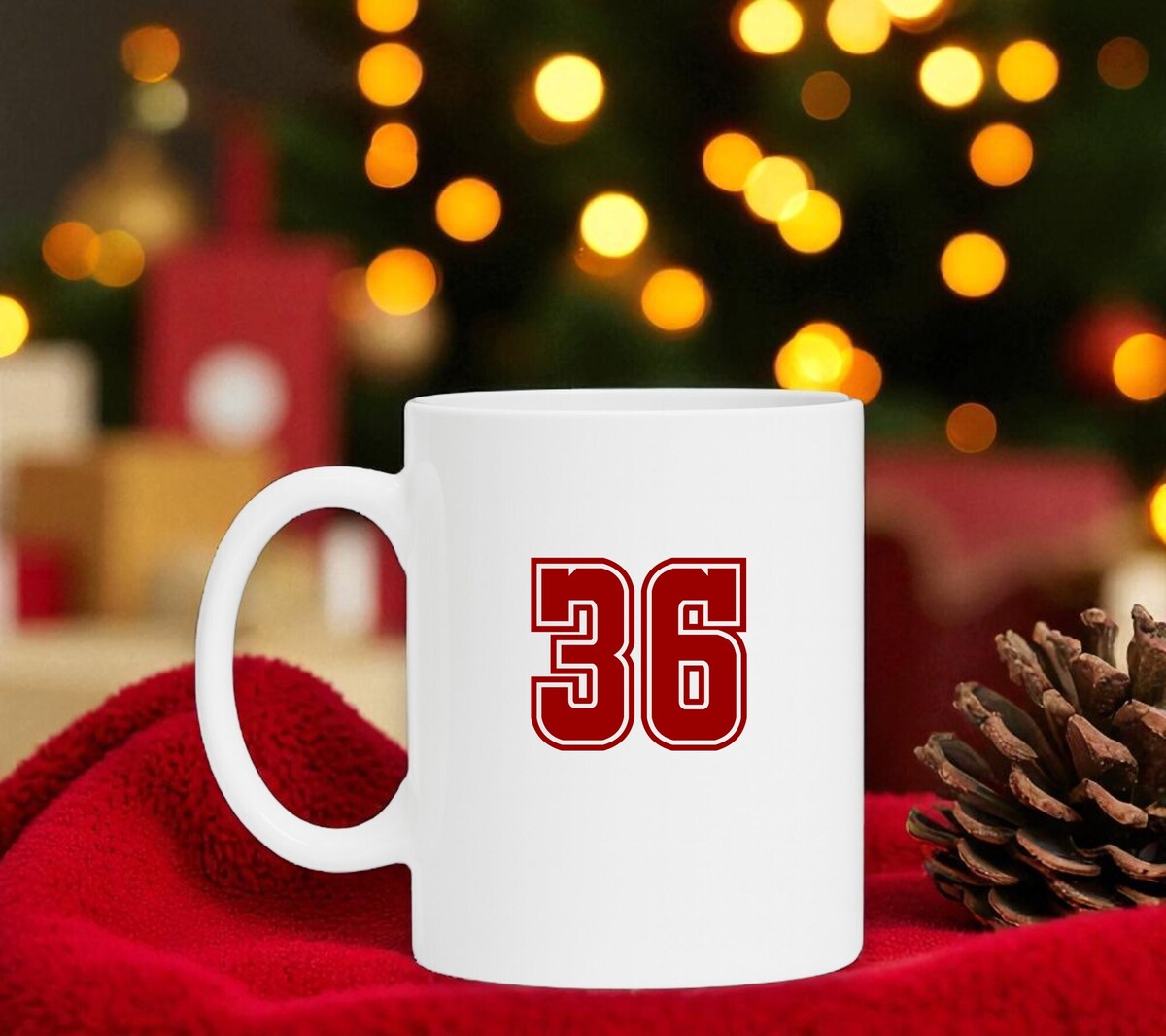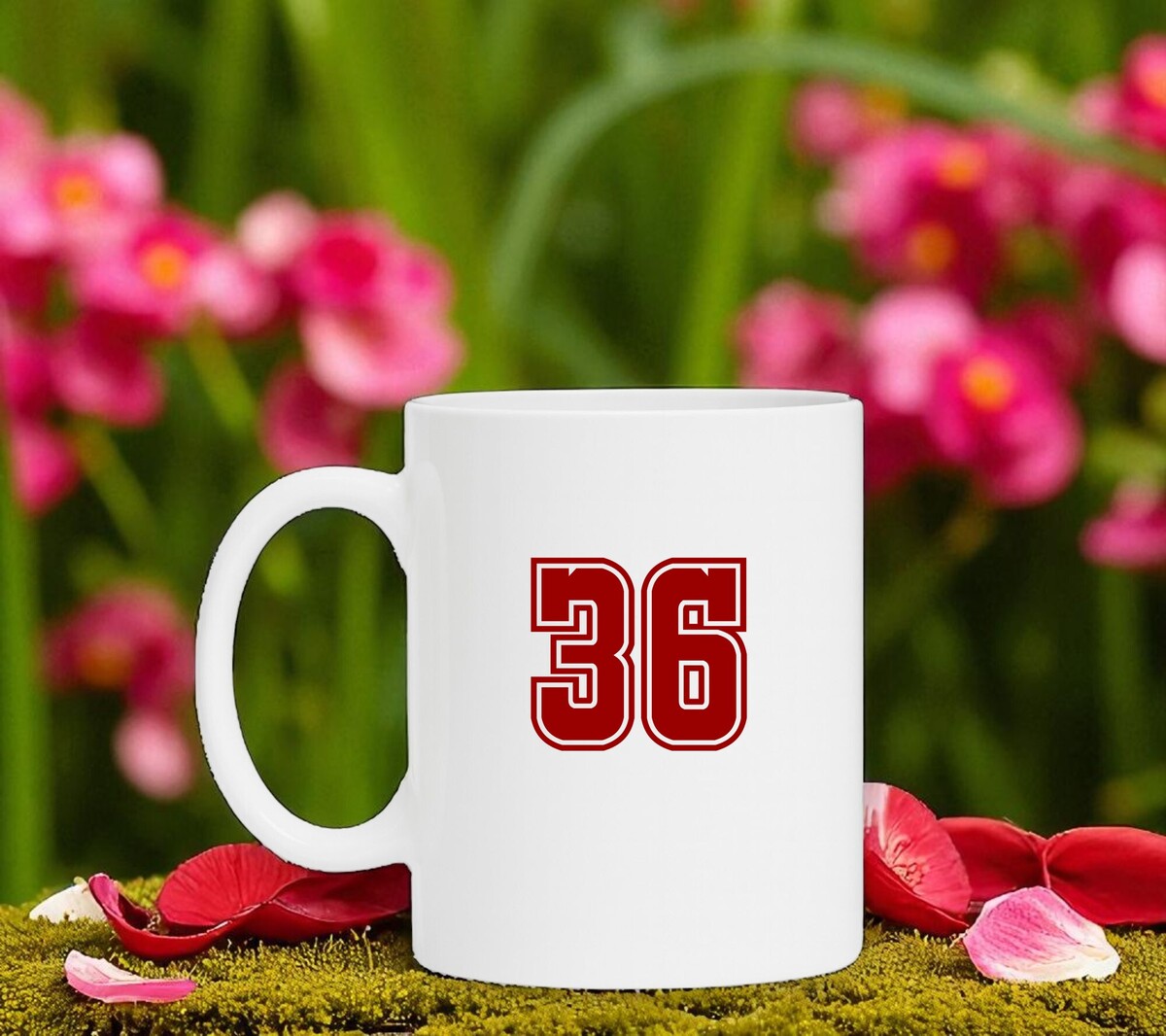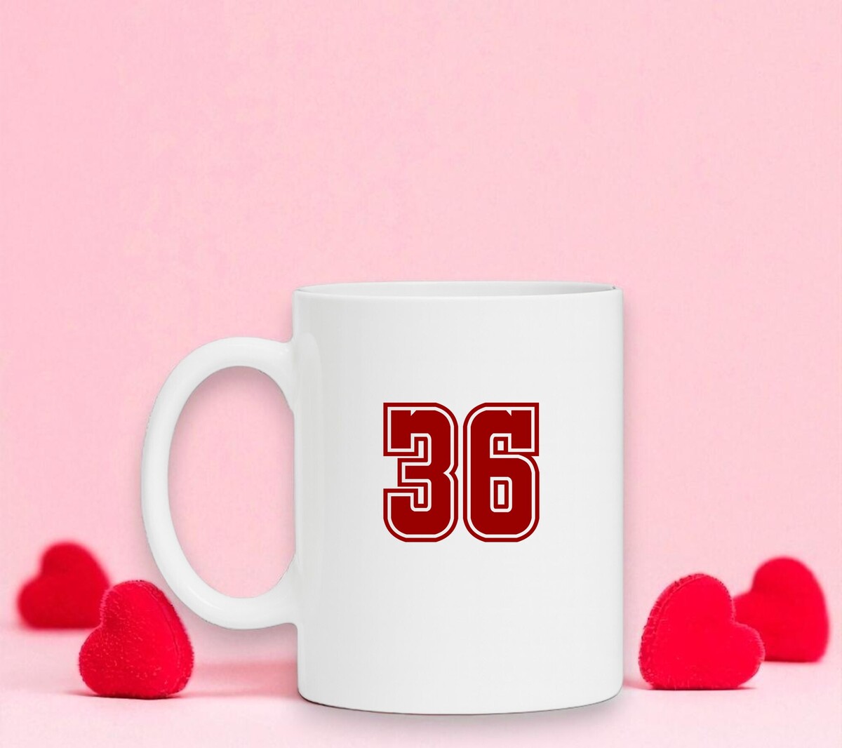 Mok wit getal 36 opdruk in de kleur robijnrood. Hoogte mok 9cm.
