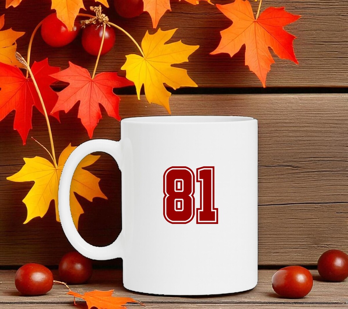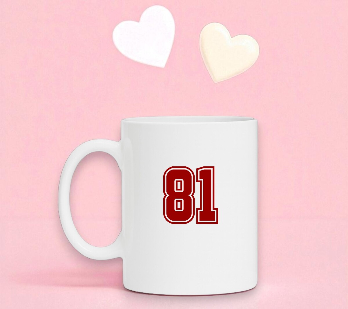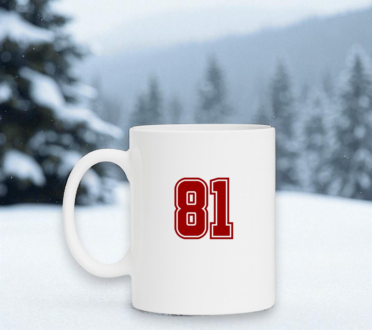 Een wittte mok met als opdruk het getal 81 in de mooie diepe kleur robijnrood.