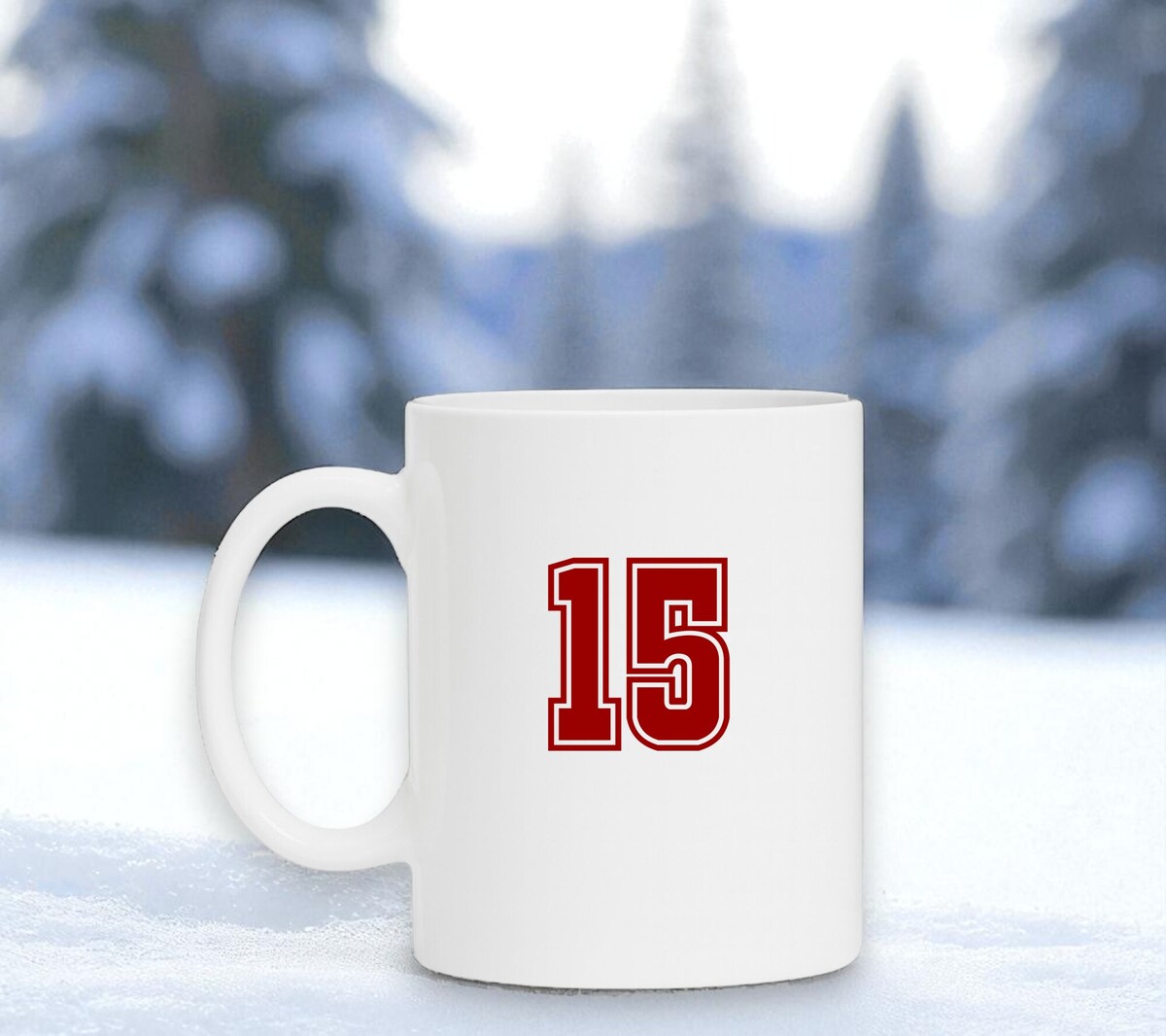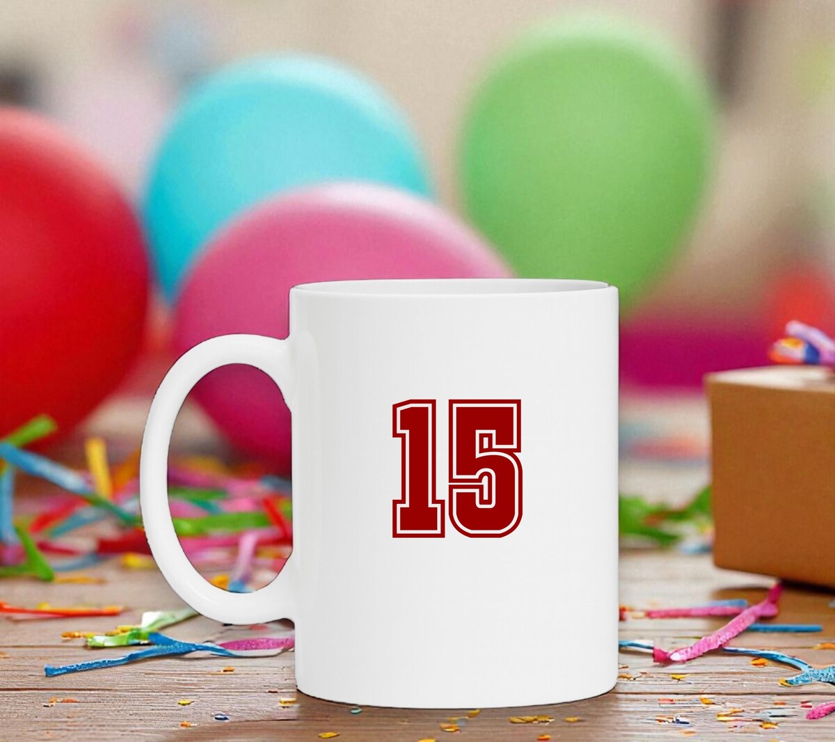 Mok wit met cijfer 15 als opdruk. Opdruk is in de kleur robijnrood.