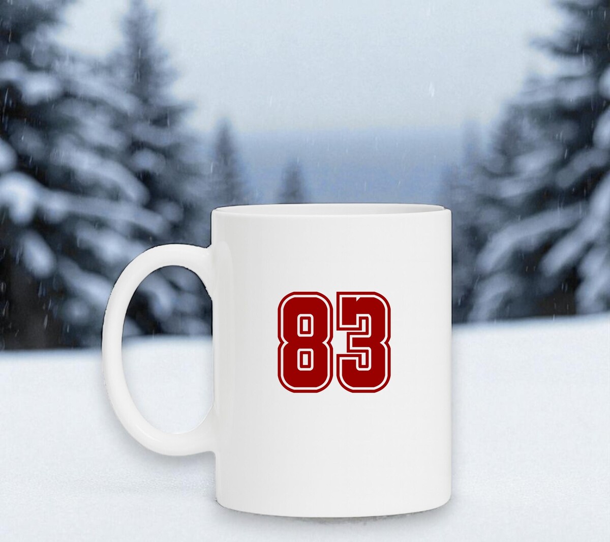 Witte koffiebeker met de opdruk van het cijfer 83 in de diepe rode kleur robijnrood.