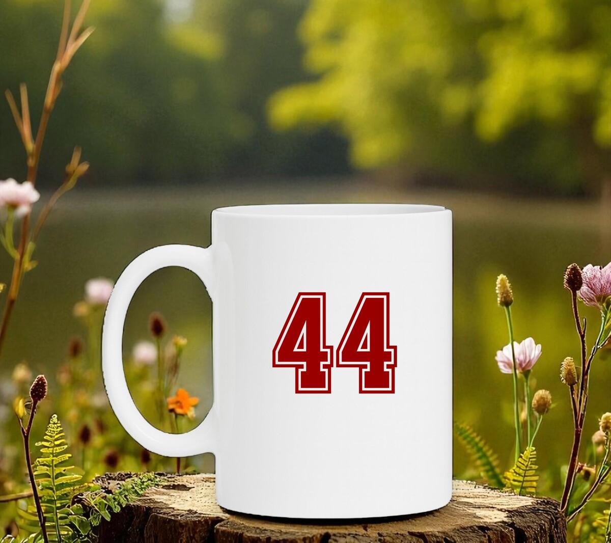 Mok wit met getal 44 als opdruk. De hoogte van de mok is 9cm en de opdruk is in de kleur robijnrood.