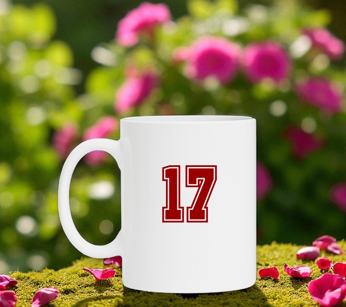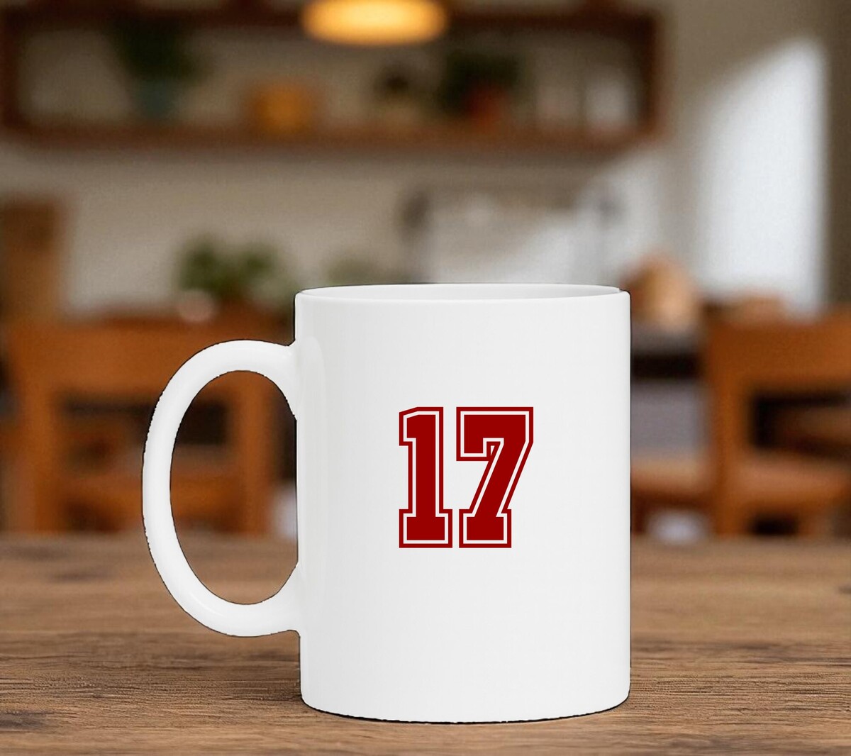 Mok wit met het cijfer 17 als opdruk. Tekst is in de kleur robijnrood. Hoogte mok 9cm.