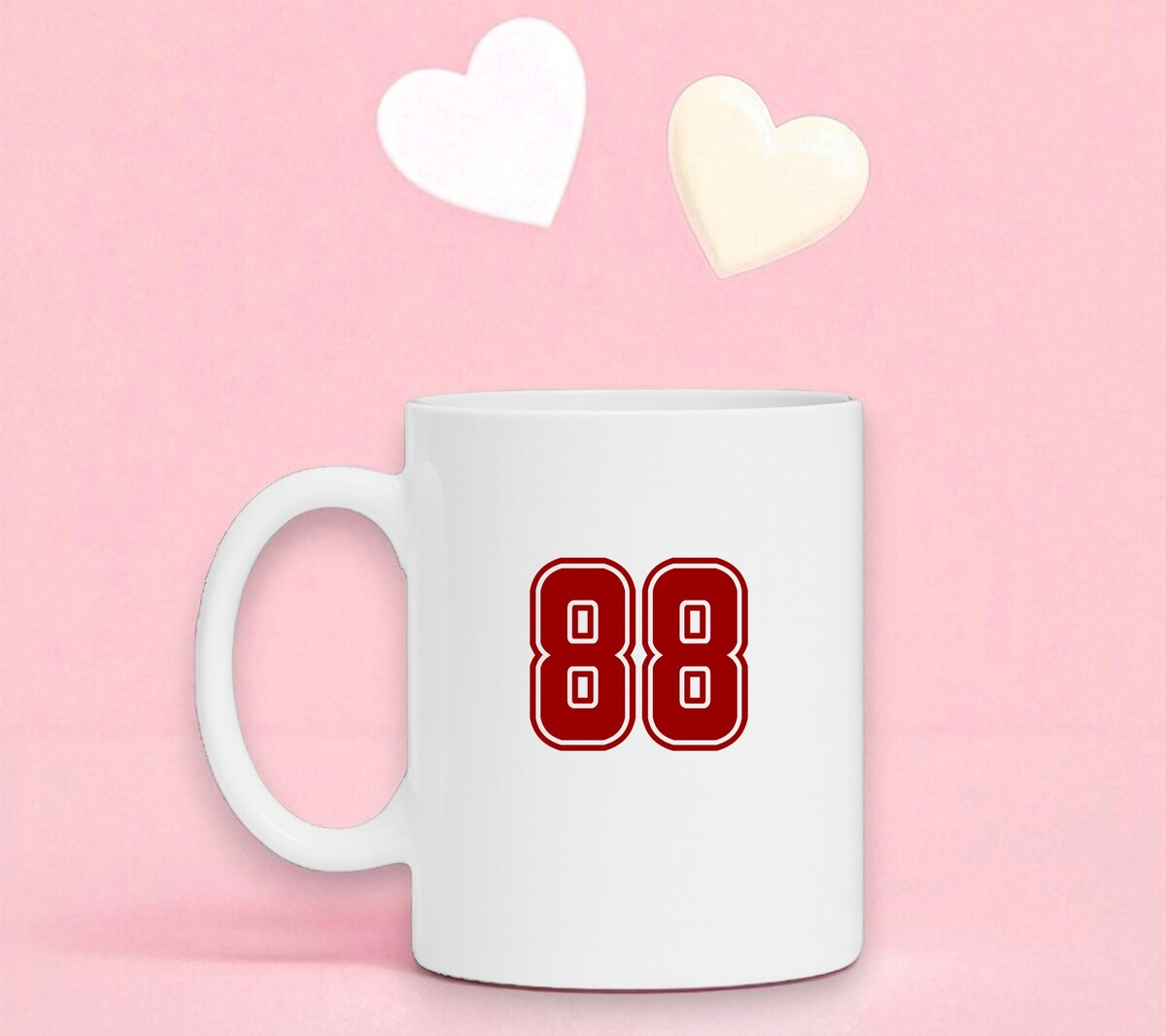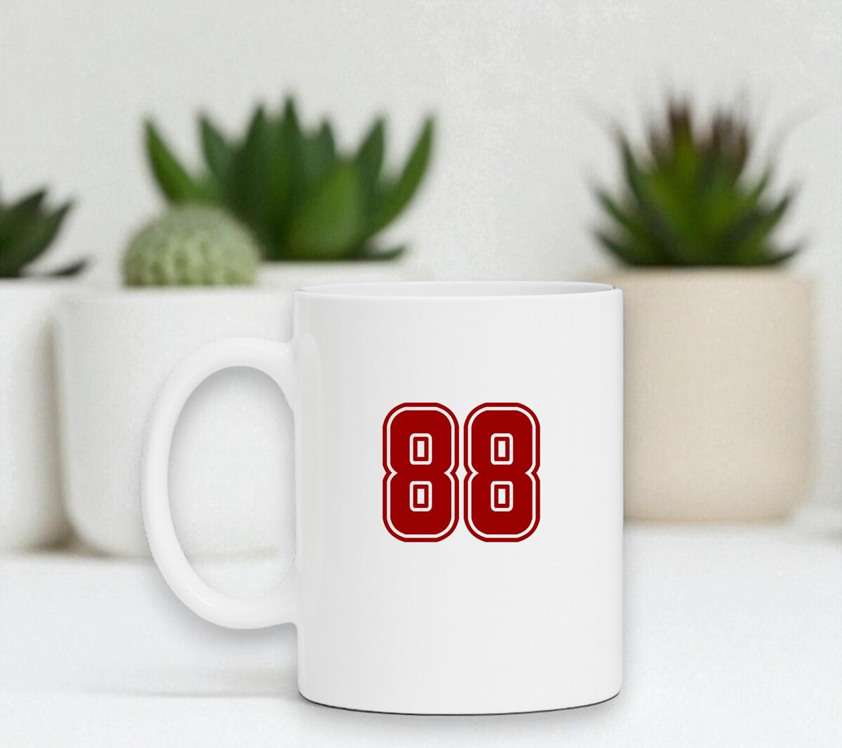 Een fraaie witte mok met het cijfer 88 in het robijnrood als opdruk. De hoogte van de mok is 9cm.