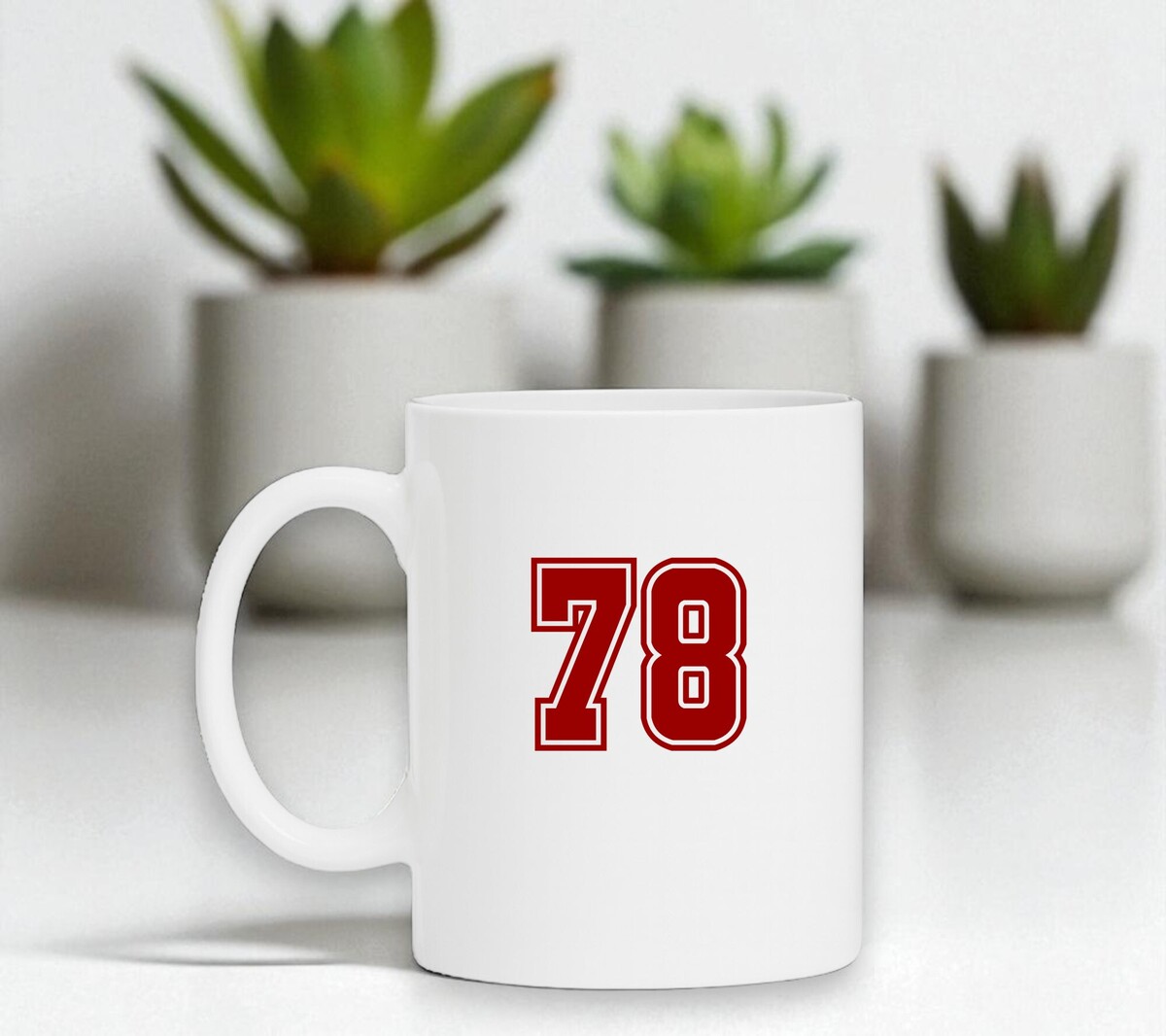 Mok wit met het getal 78 erop gedrukt in de fraaie kleur robijnrood.