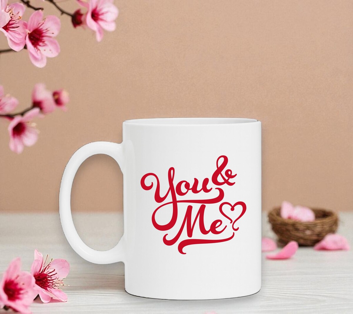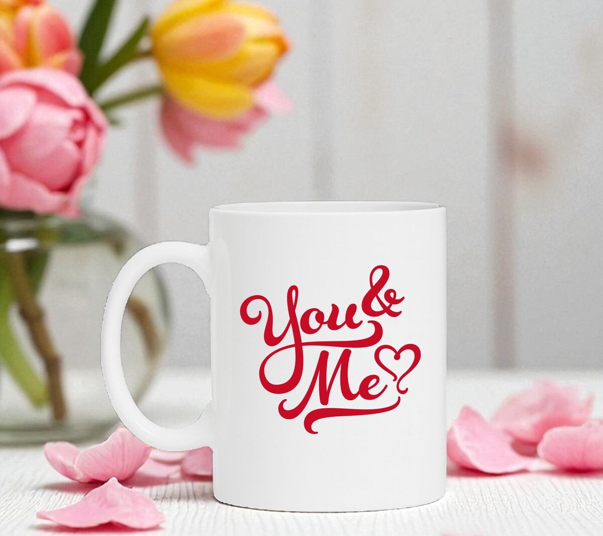 Valentijn koffie of thee mok met de opdruk you and me. De mok is vaatwasserbestendig en magnetronbestendig. De mok heeft een hoogte van 96mm en een diameter van 80mm