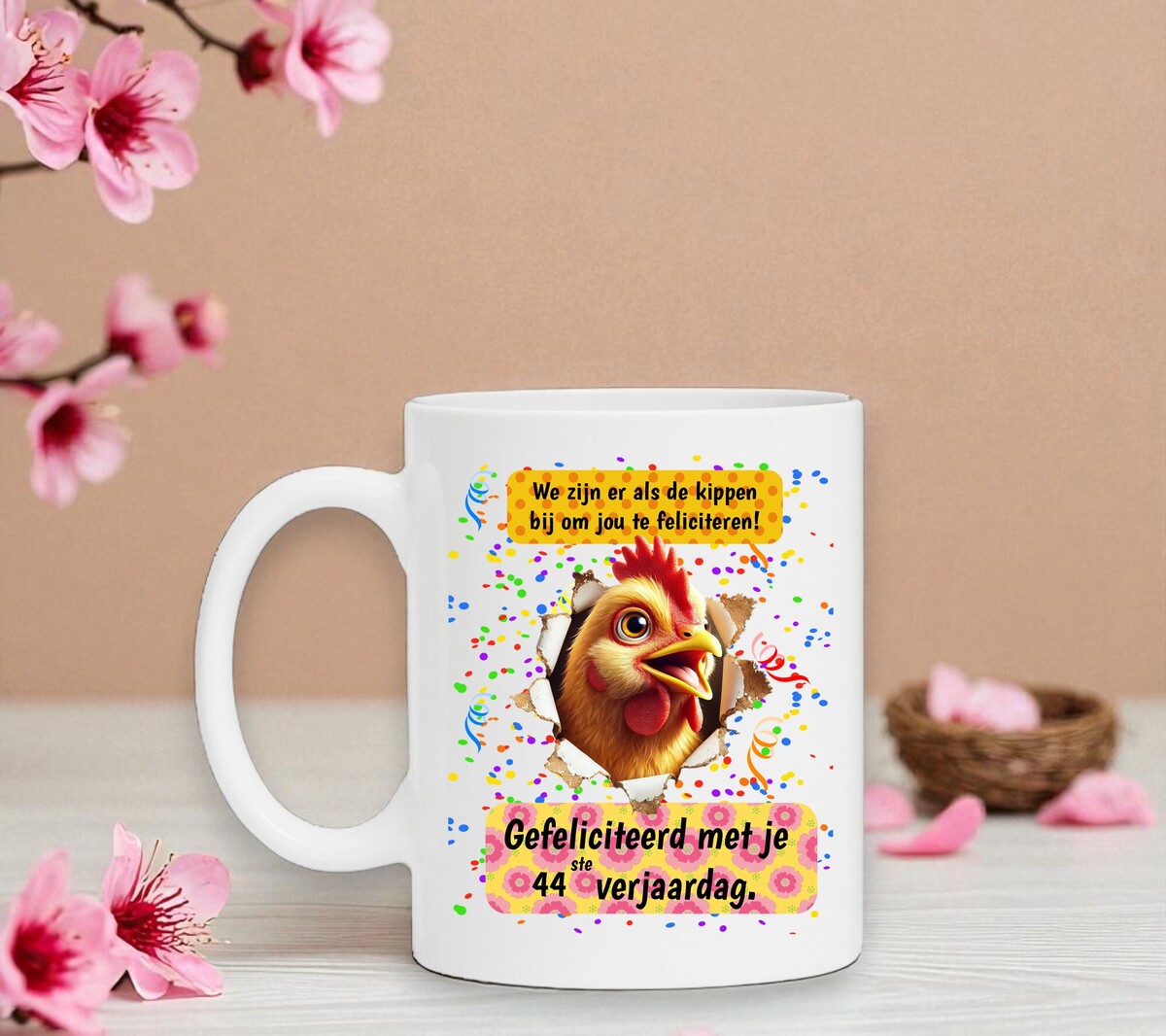 Een prachtige koffiemok met de tekst ‘We zijn er als de kippen bij om jou te feliciteren! Gefeliciteerd met je 44ste verjaardag.’ Een leuk presentje voor hem of haar die 44 wordt. Leuker dan een bloementje sturen!